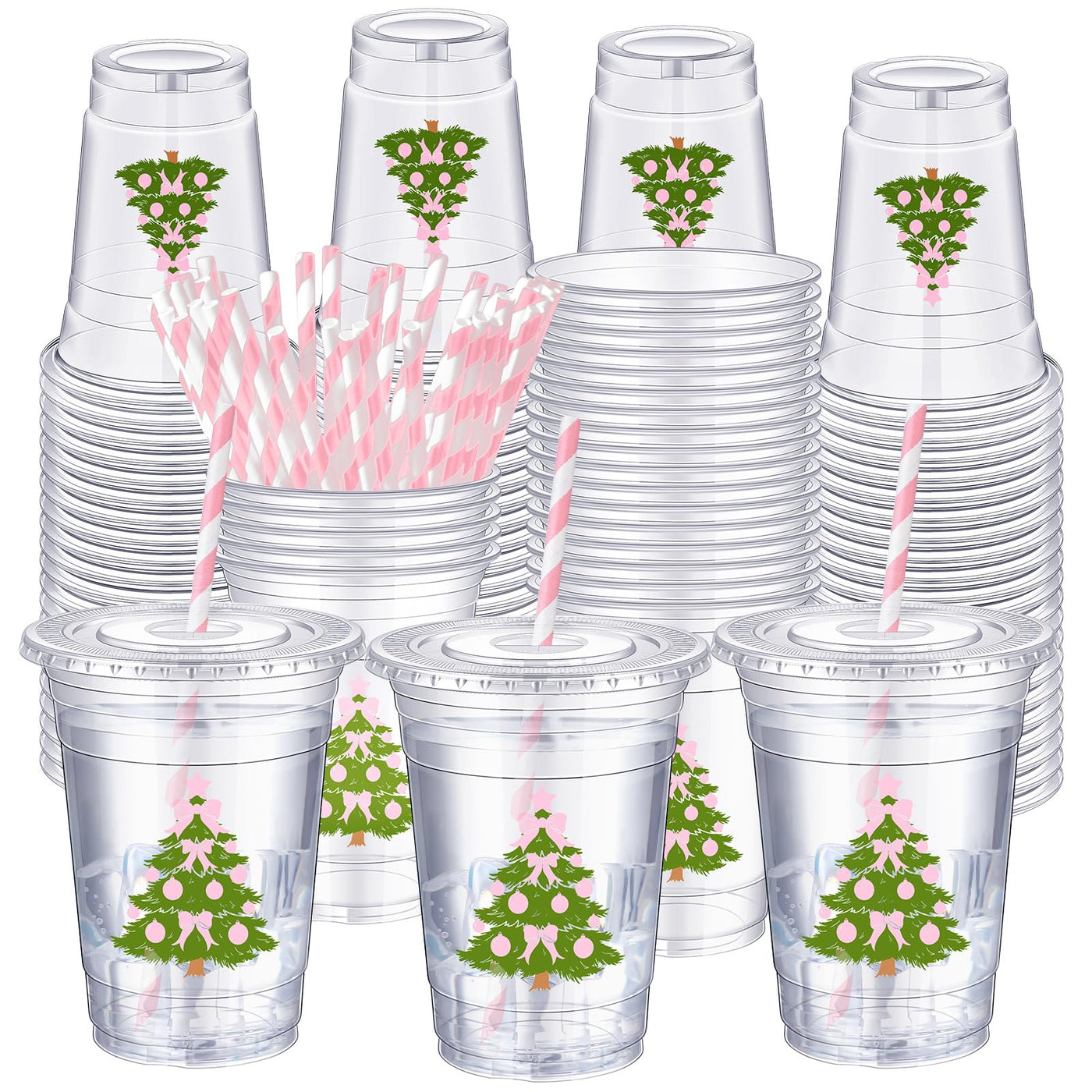Sliner 50 Pcs 16 oz Coquette Disposable Plastic Cups with Straw for Party Supplies Bow Cup Birthday Wedding Bridal Engagement Dr