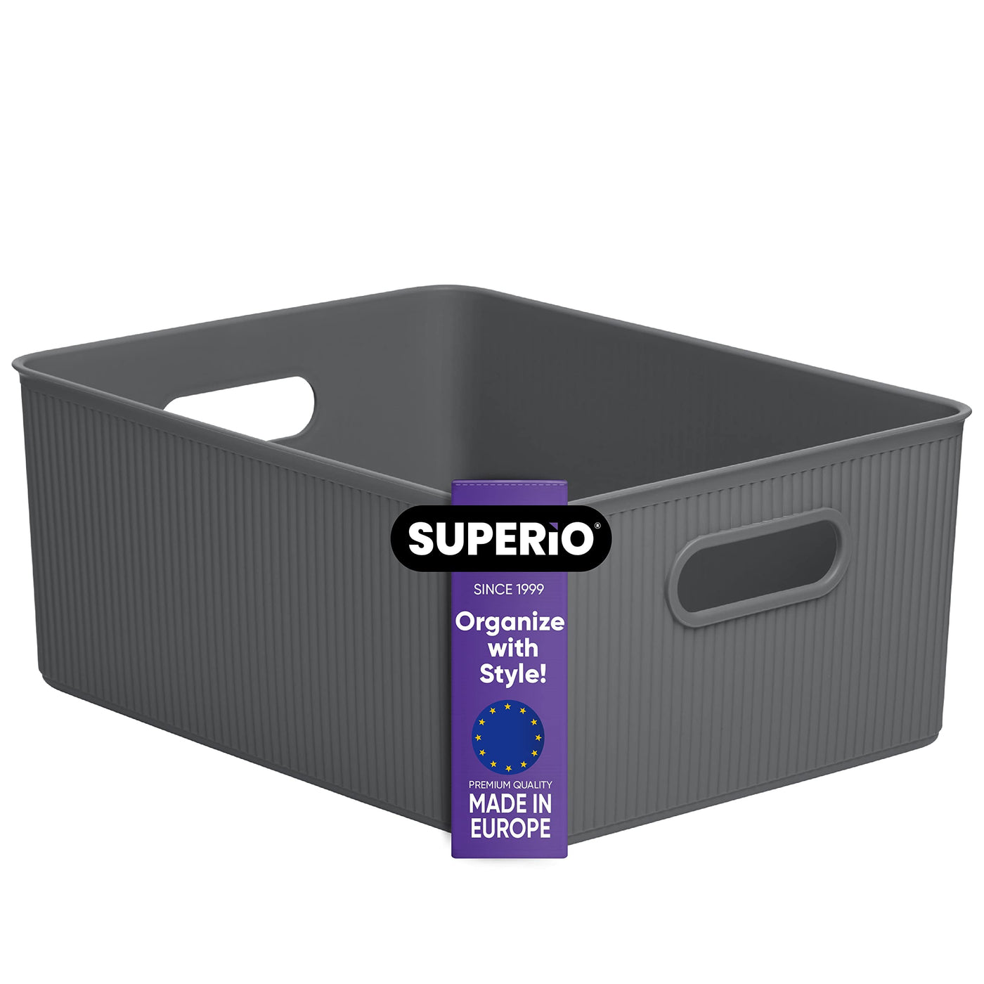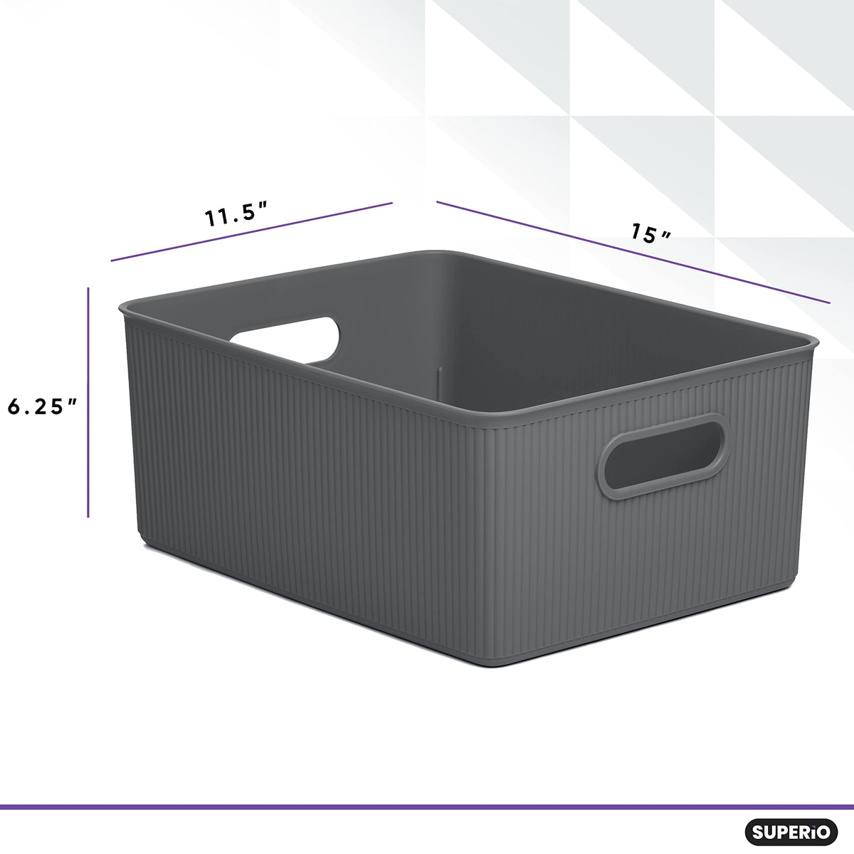 Superio Ribbed Collection - Decorative Plastic Open Home Storage Bins Organizer Baskets, Large Grey (1 Pack) Container Boxes For