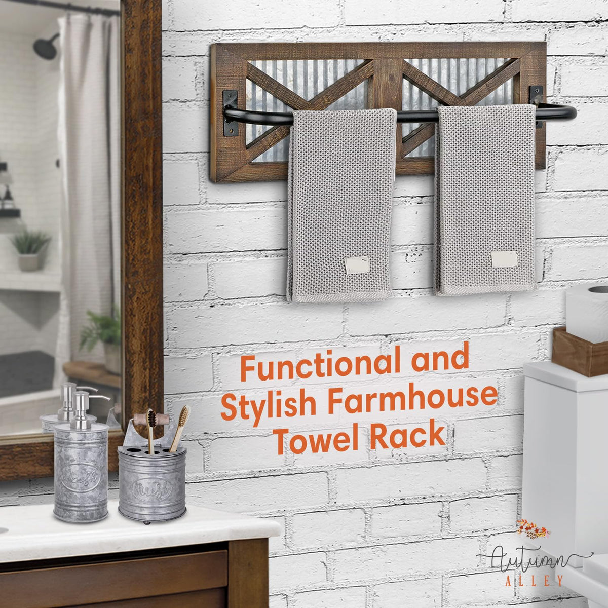 - Q: What materials is the Autumn Alley Farmhouse Rustic Towel Rack made of? A: The towel rack is crafted from weathered solid wood, corrugated galvanized metal, and features a matte black bar rod, giving it a rustic touch.