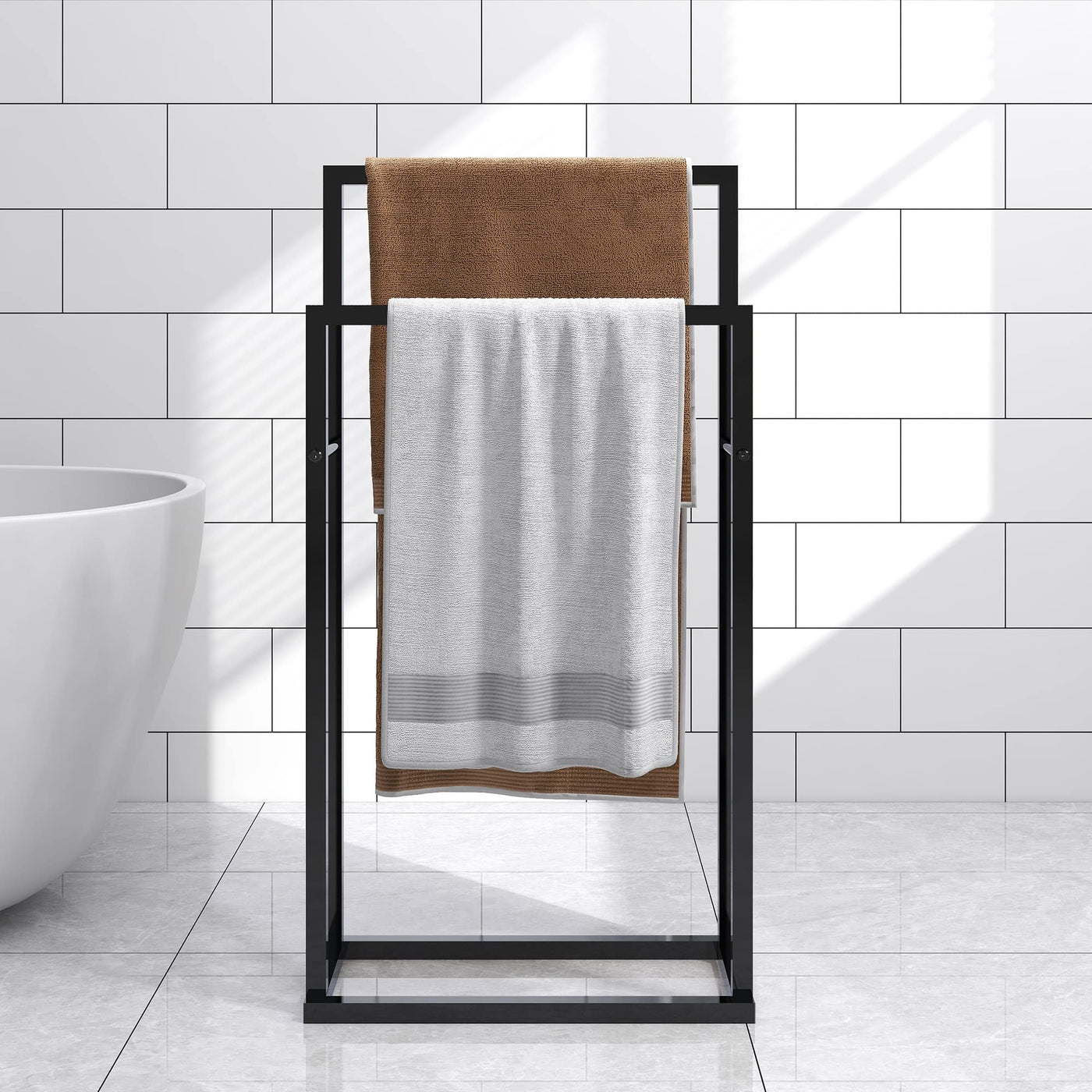 Bofeng 2-Tier Freestanding Black Towel Rack Steel Metal Towel Bar Holder,Modern 2 Bars Ladder Rust-Resistant Drying Rails,Bathro