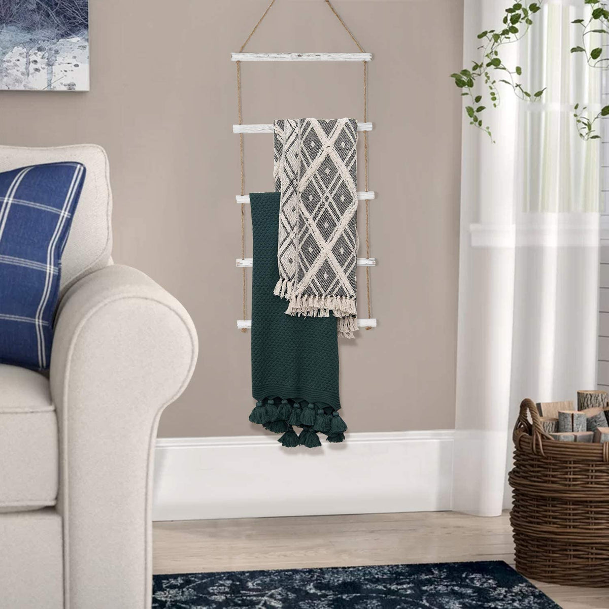 Docmon Towel Rack For Bathroom- 3.3-Foot Wall Hanging Whitewashed Wood & Rope Blanket Ladder With 5 Rungs For Farmhouse Room Dec