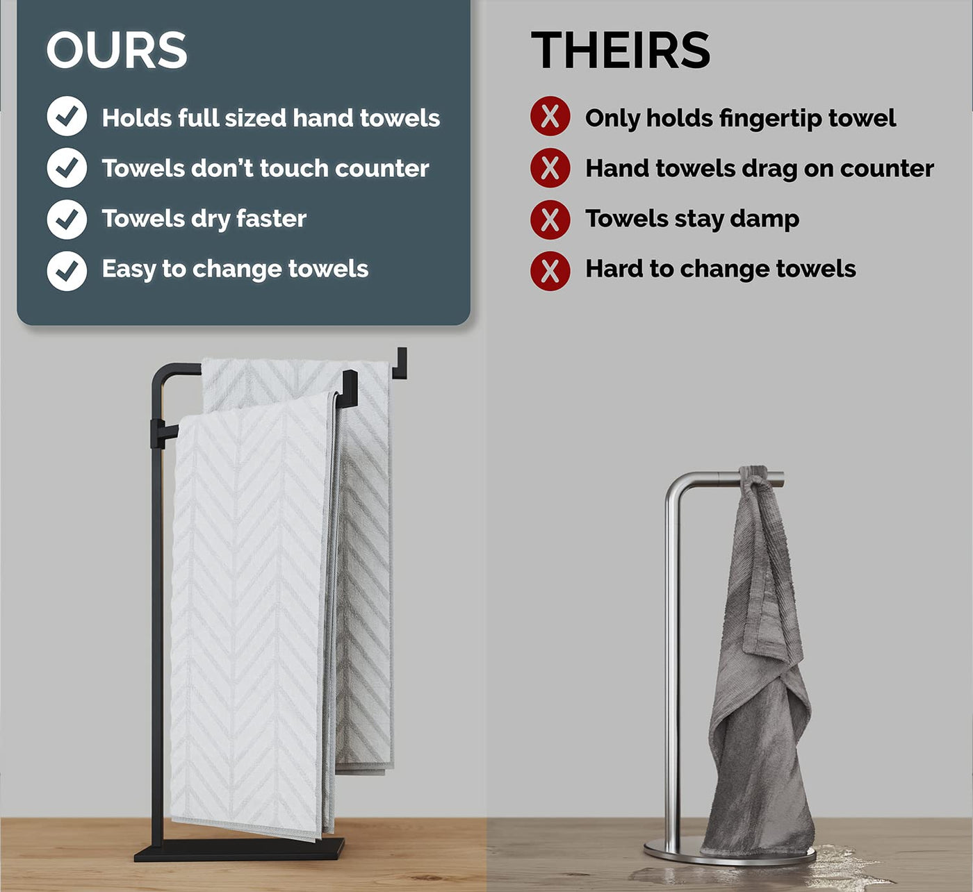 - Q: How many hand towels can this holder accommodate? A: This holder can accommodate two full-sized hand towels, ensuring they do not drag on the countertop.