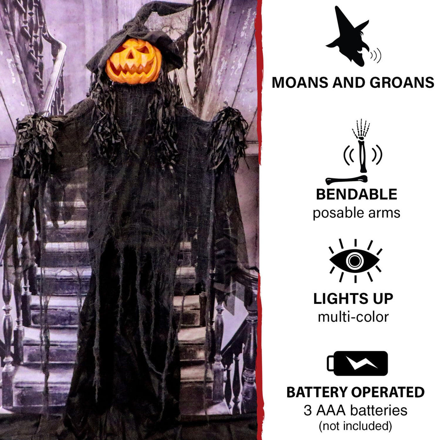Be very afraid of Haunted Hill Farms collection of spooky props. These blood-curdling creatures are sure to terrify any trick-or-treaters, coworkers, or customers. Gourdy the pumpkin has a witchy appearance with a long, wispy black robe and black pointed hat. His pumpkin head is carved into a spooky grin and illuminates with multicolored lights when activated. Unsettling moans and ominous noises start up unexpectedly when Gourdy comes alive to scare the neighborhood. Battery operated with poseable arms, he includes a stand so you can display him wherever you want. Place him on the front porch to greet visitors or in your living room to complement the rest of your spooky decor. His lightweight figure makes it easy to move him from place to place, anywhere you need your next scare. For longer prop life, we recommend indoor or sheltered outdoor use protected from inclement weather. For thrills and chills so frightening that your neighbors will run shrieking in horrendous delight, count on Halloween decorations from Haunted Hill Farm.
