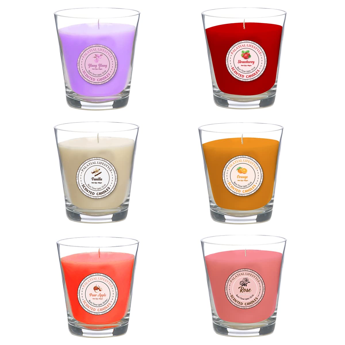 Palatial Lifestyles Glass Scented Candles For Home,Set Of 6,Scented Candles For Bedroom,Fragrance Candle,Aroma Candles (Ylang Ylang,English Vanilla,Enticing Rose,Tangy Orange,Passionate Strawberry)