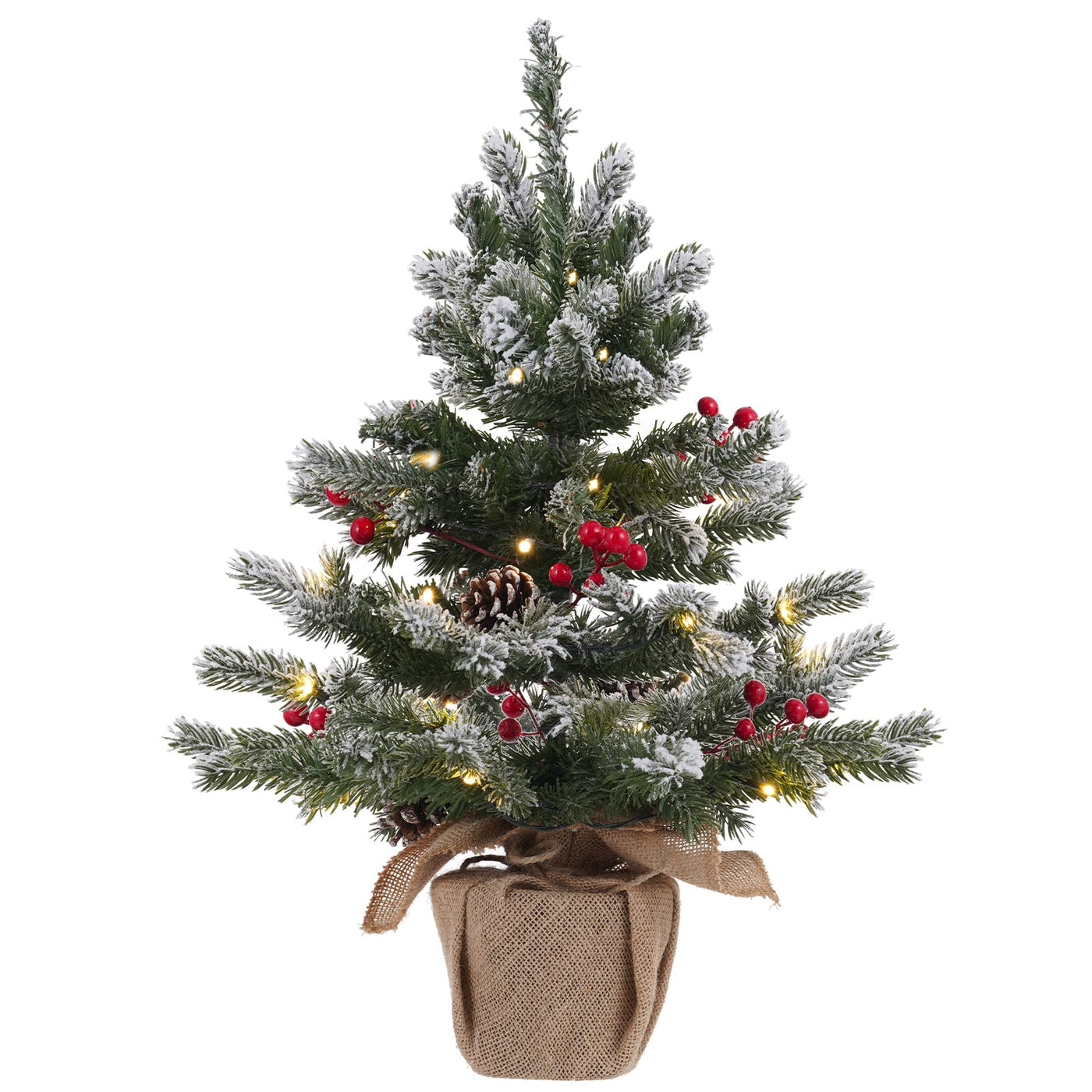 24 Inch 2 FT Pre-lit Snowy Mini Christmas Tree, DECSPAS Small Tabletop Flocked Christmas Tree with 20 LED Lights Red Berries Pin