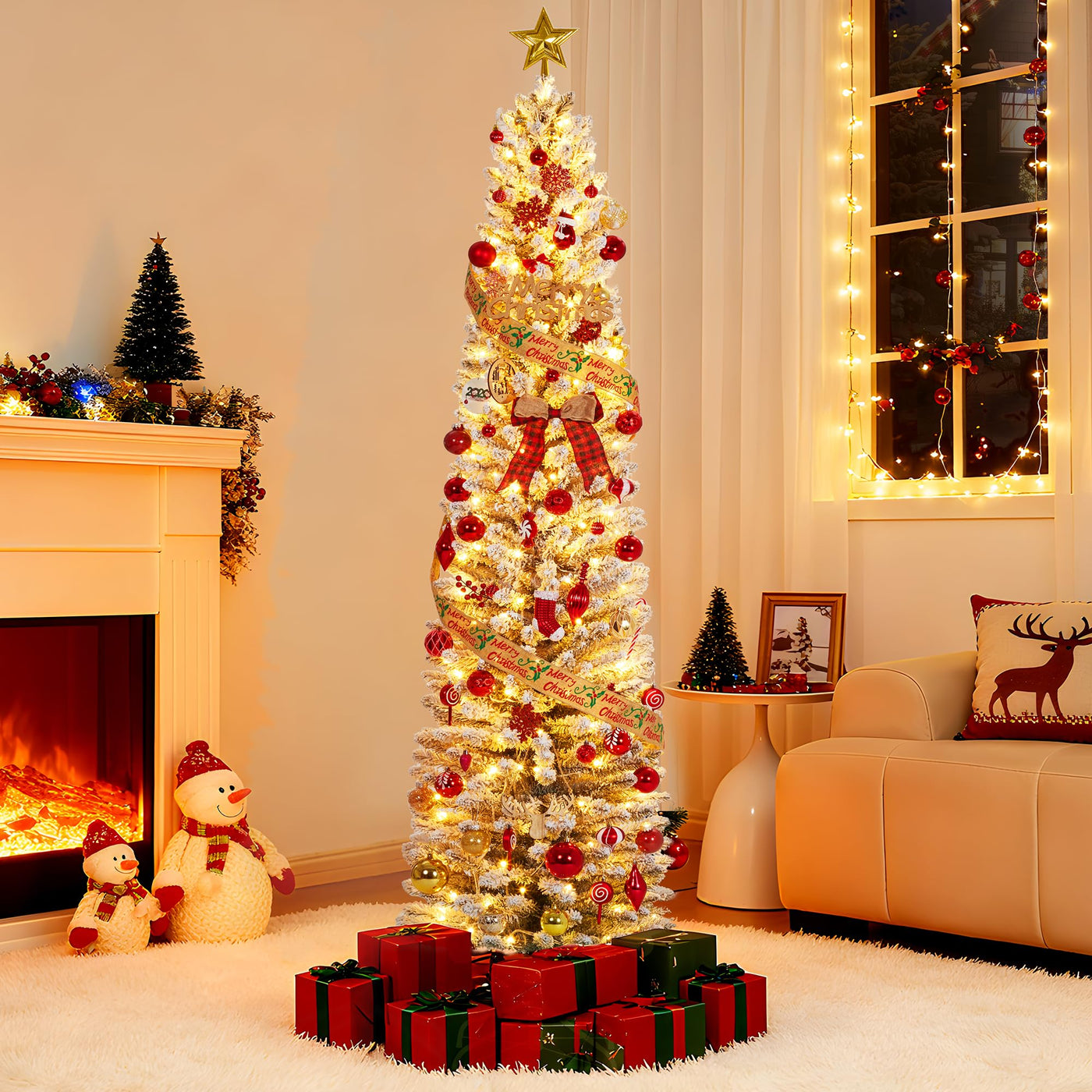 7.5Ft Pre-Lit Snow Flocked Pencil Christmas Tree, Fir Hinged Slim Skinny Corner Xmas Tree with 155 Incandescent Warm White Light
