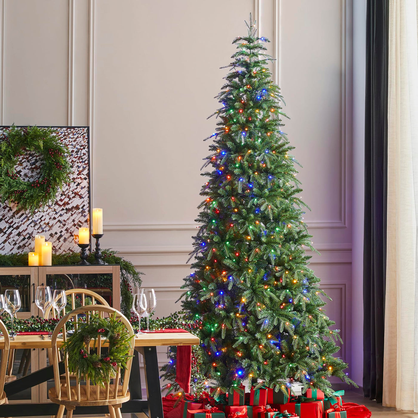 Descriptions: The 9ft Pre-Lit Green Slim Fir Christmas Tree features a lush, space-saving design with warm pre-lit lights for a cozy holiday glow. Its realistic look and easy assembly make it a hassle-free choice for a beautiful and festive Christmas display. Features: 1. Simple Setup technology makes installation easy, with lights integrated into the trunk for hassle-free lighting. 2. Natural appearance look realistic, comes with sturdy steel metal stand, fits beautifully in both large and small spaces. 3. Slim fir layered structure and warm white/multi-color LED lights, featuring 9 modes of lighting to evoke a fragrant Christmas atmosphere. 4. Made with new materials, safe for kids and pets. 5. Tip count: A total of 3013 tips, including 1494 PE tips and 1519 PVC tips on the 9ft version. 6. The remote control included allows easy control of the lights. 7. Energy-efficient, long lasting and gentle LED lights are eye friendly for kids. 8. Hinged construction, shape tree by fluffing out the branches and tips. 9. The 9t version has four sections, red ribbon labels in the cords are easy to find to connect during installation. 10. Extra white gloves are for your safety.