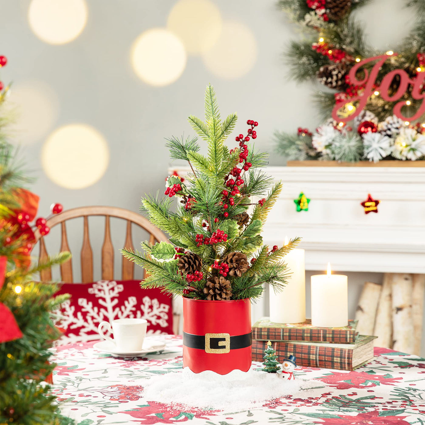 Glitzhome Lighted Christmas Tree for Tabletop Decorations 21 H Mini Artificial Christmas Santa Belt Potted Table Trees with Meta