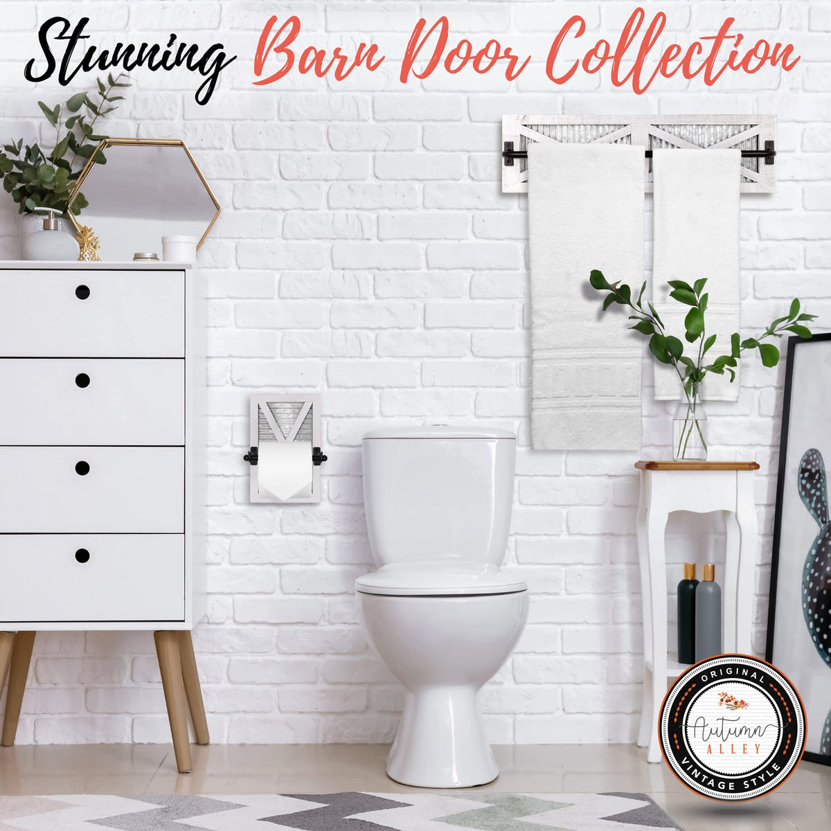 • Q: Are there other coordinating pieces available from Autumn Alley? A: Yes, Autumn Alley offers a variety of coordinating farmhouse bathroom accessories within their Barn Door Bathroom Decor line to complete your rustic decor.