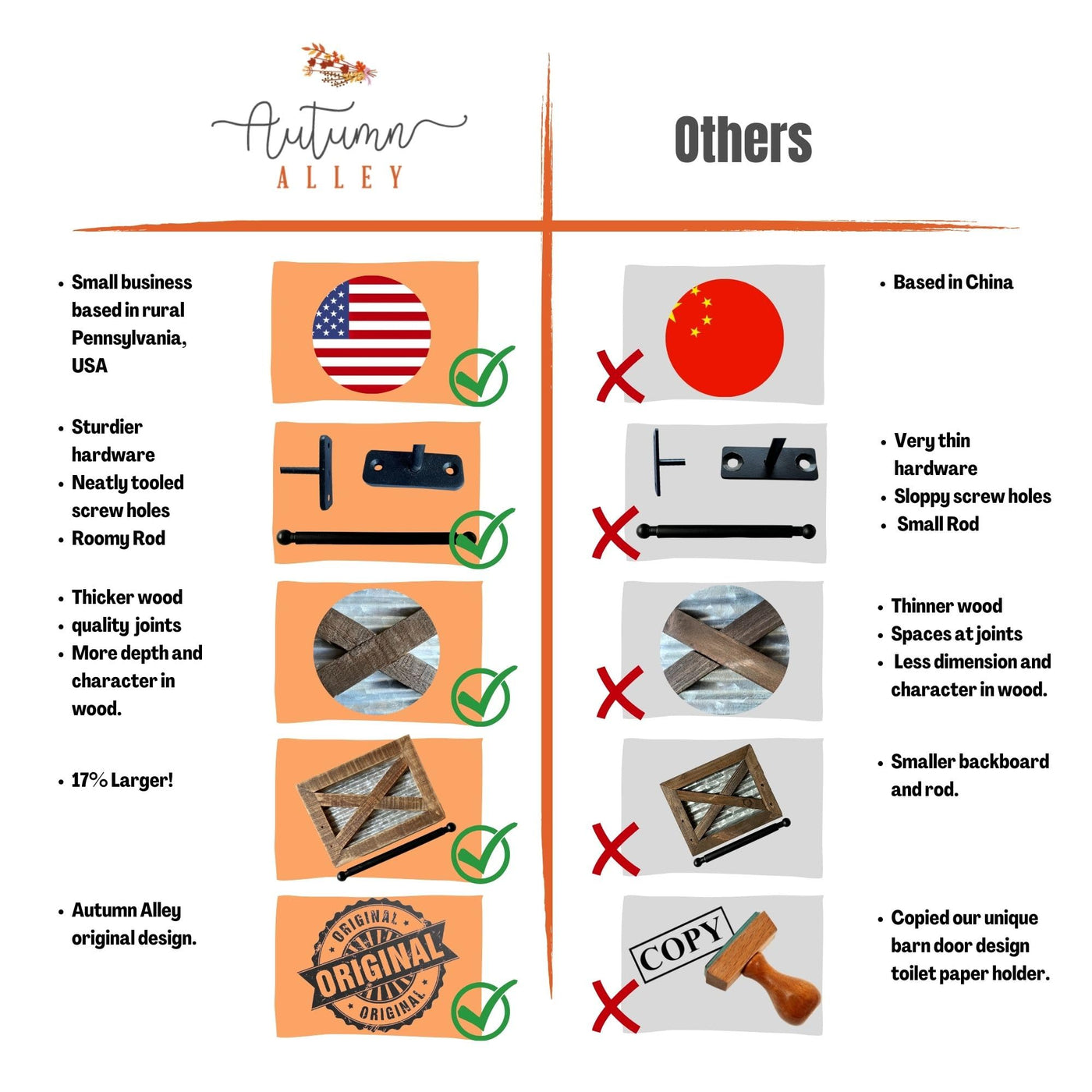 • Q: What is the style of the Autumn Alley Rustic Toilet Paper Holder? A: This toilet paper holder features a timeless rustic farmhouse style, adding warmth and character to your bathroom.