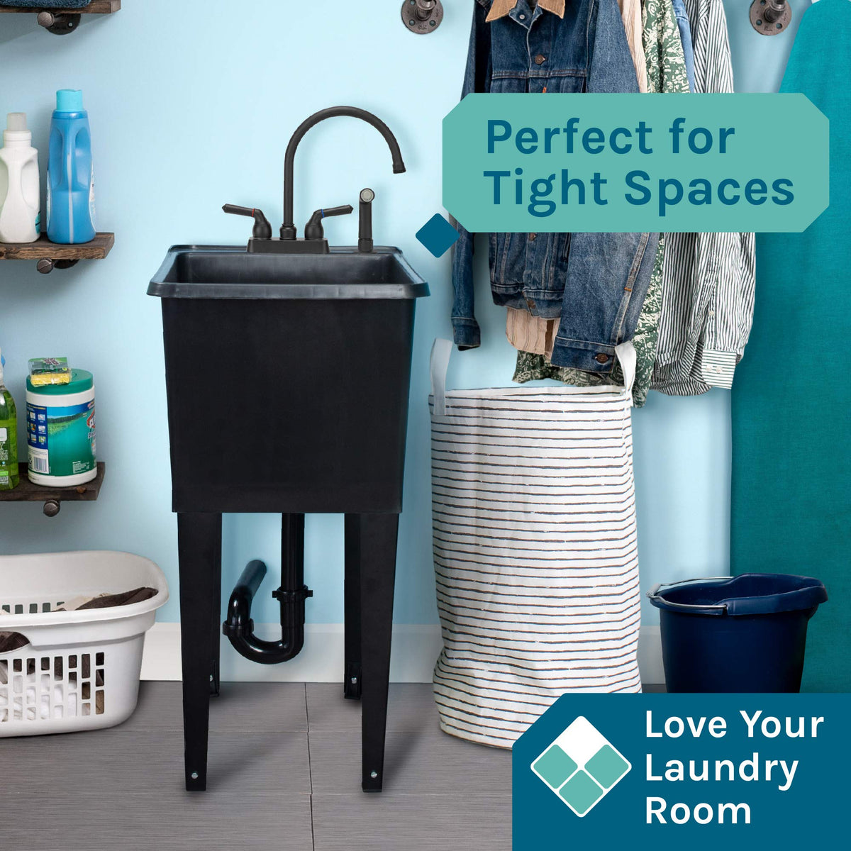 Black Space Saver Utility Sink By Js Jackson Supplies, Freestanding Tehila Space Saving Laundry Tub, Black Gooseneck Faucet With