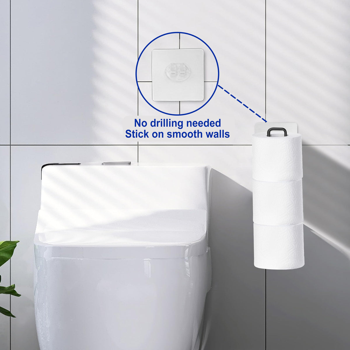 - Q: How do I install the toilet paper holder? A: The holder can be installed using hooks to hang on the toilet tank or over a cabinet door. It also comes with adhesive stickers for smooth surface mounting.