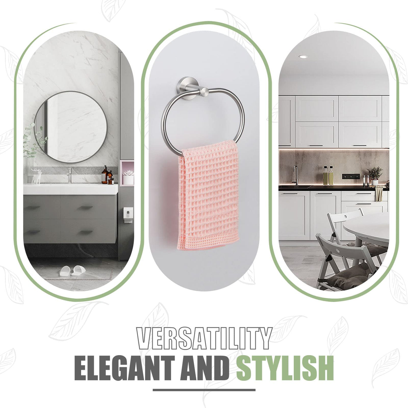 • Q: What is the finish of the Towel Ring? A: The Towel Ring features a brushed nickel finish that adds a modern and elegant touch to your bathroom or kitchen.