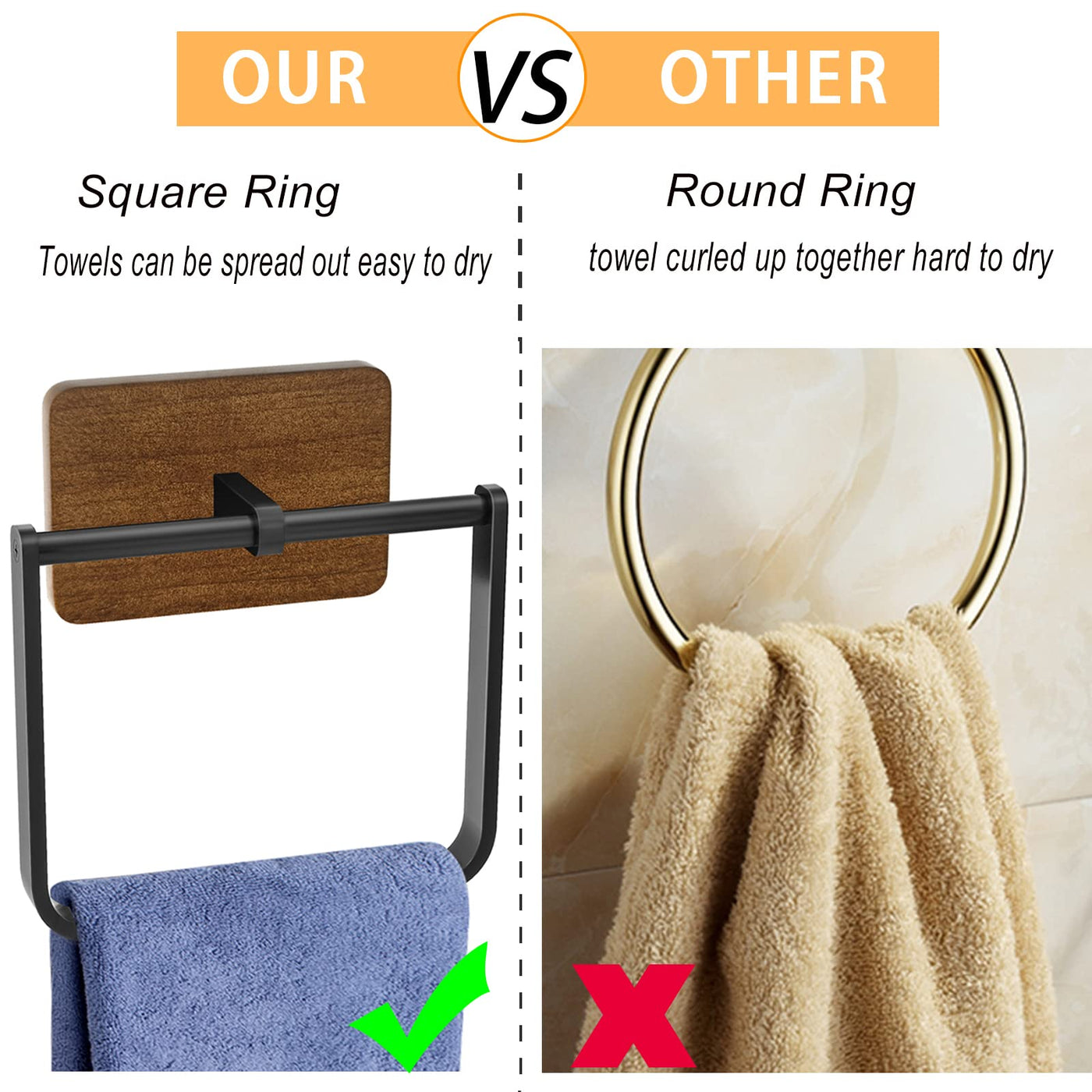 - Q: What is the design of the towel ring? A: The towel ring features a matte black square design that prevents towels from slipping and allows for quick drying, while the wooden base plate adds a fashionable touch.