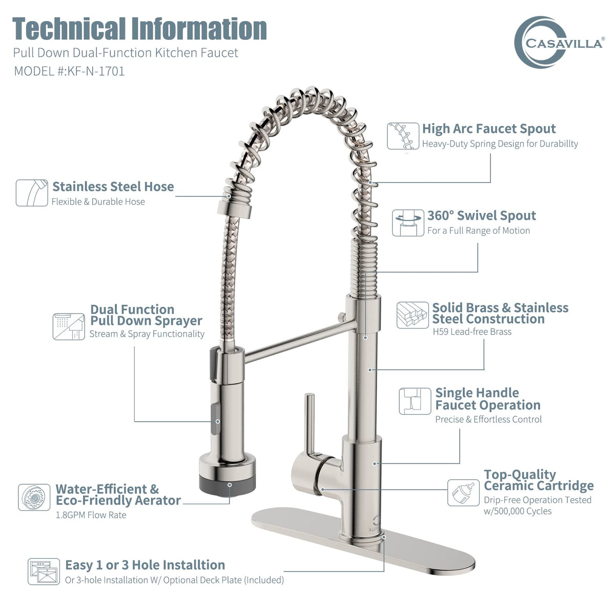 • Q: What materials are used in the construction of this faucet? A: The faucet is made from lead-free solid brass and features a commercial-grade stainless steel spring construction, ensuring durability and long-lasting performance.