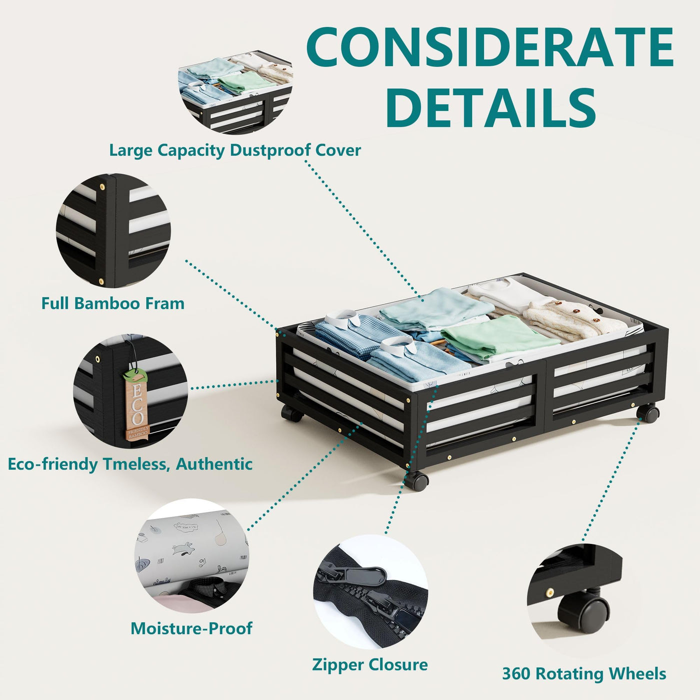 Bamboo Under Bed Storage Containers- Underbed Organizer with Wheels with Large Capacity Dust Bag,Sturdy Wood Rolling Under Bed S