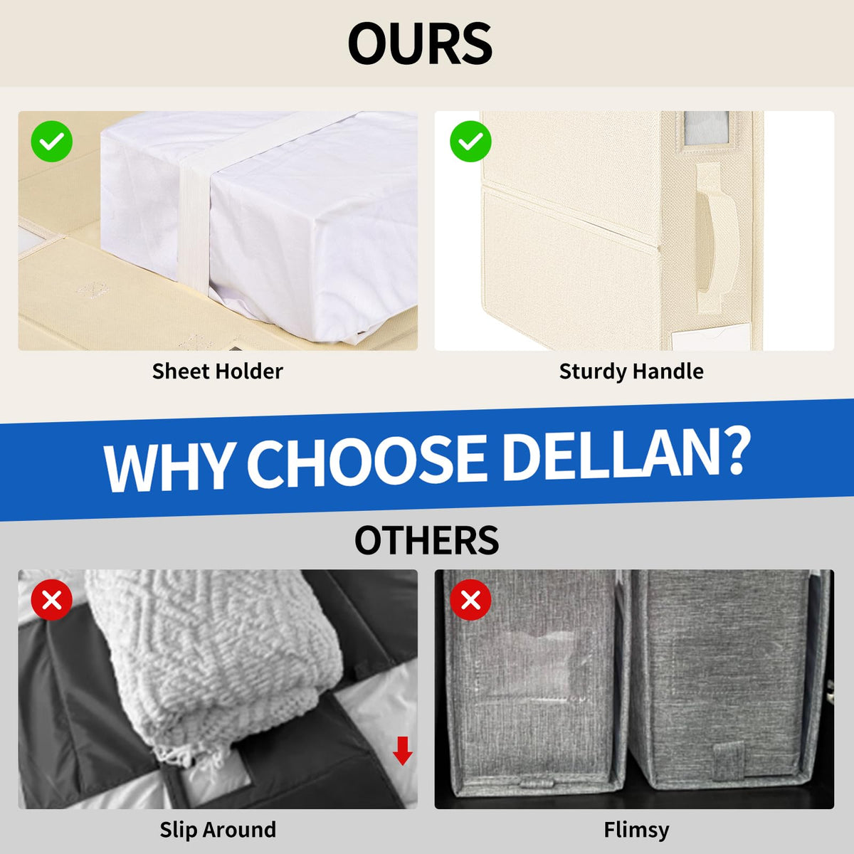 - Q: What are the dimensions of the DELLAN Bed Sheet Organizer? A: The product is designed to accommodate standard Queen and King bedding sizes, though specific dimensions are not provided.