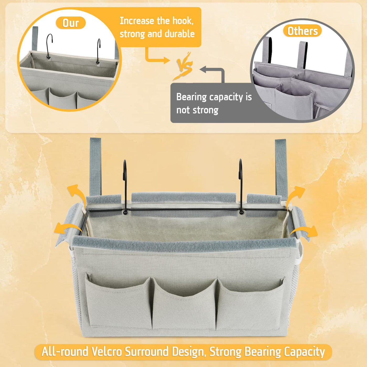 - Q: How does the caddy stay in place? A: The caddy features adjustable straps on both sides and a metal hook to securely attach it to the bed, preventing sagging.