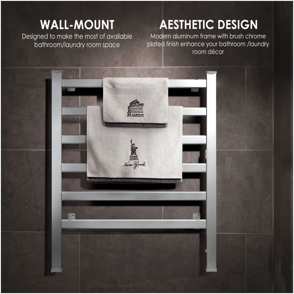 • Q: What materials is the towel warmer made from? A: The towel warmer is constructed from brushed-surface aluminum, providing durability and a modern look.