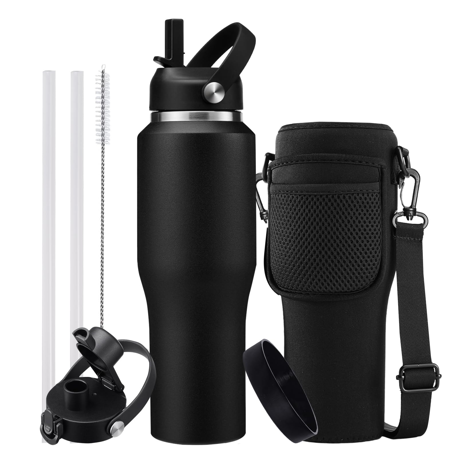 32Oz Insulated Water Bottle Tumbler With Straw - Auto Spout Lid, Protective Boot, Carrier Pouch, Vacuum Stainless Steel Water Bo
