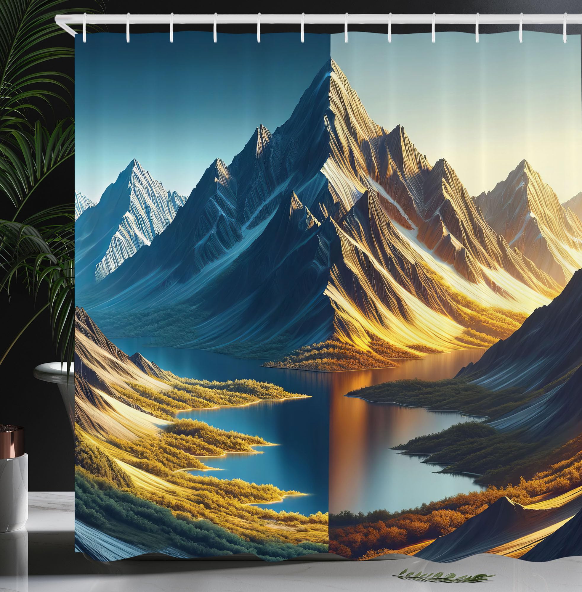 Ambesonne Lake Shower Curtain, Dreamy Art Of Snowy Mountain Panorama With Sunny Shades And Greenery Meadows, Cloth Fabric Bathro