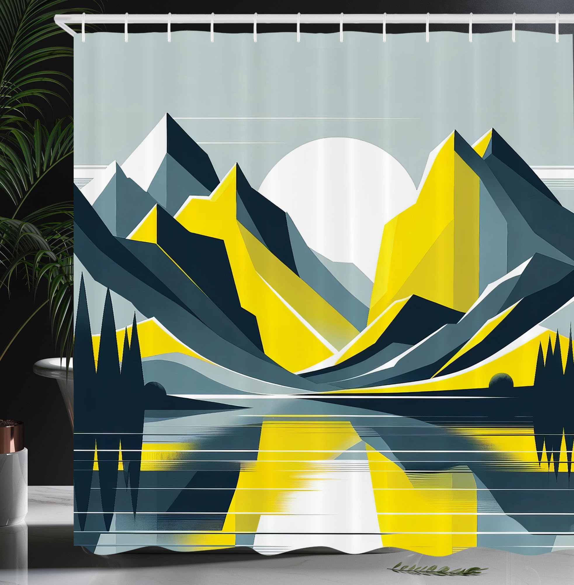 Ambesonne Lake Shower Curtain, Mid Century Modern Boho Art Of Sunrise Scenery With Minimalist Mountains, Cloth Fabric Bathroom D
