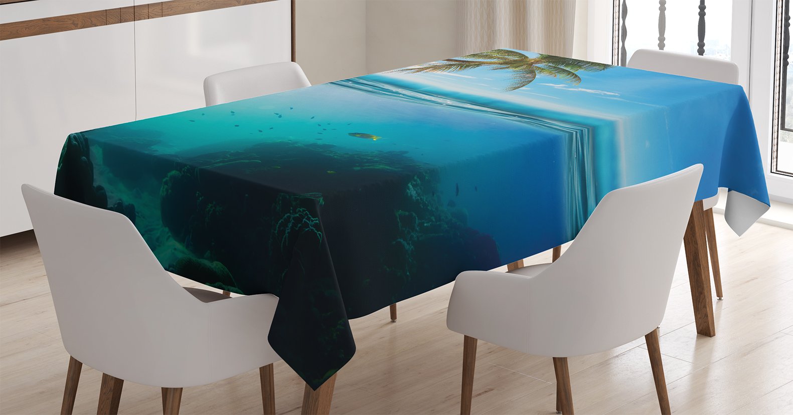 Ambesonne Ocean Tablecloth, Tropical Underwater Shot With Surface Coconut Tree And Sky Aqua Water Theme Paradise, Rectangular Ta
