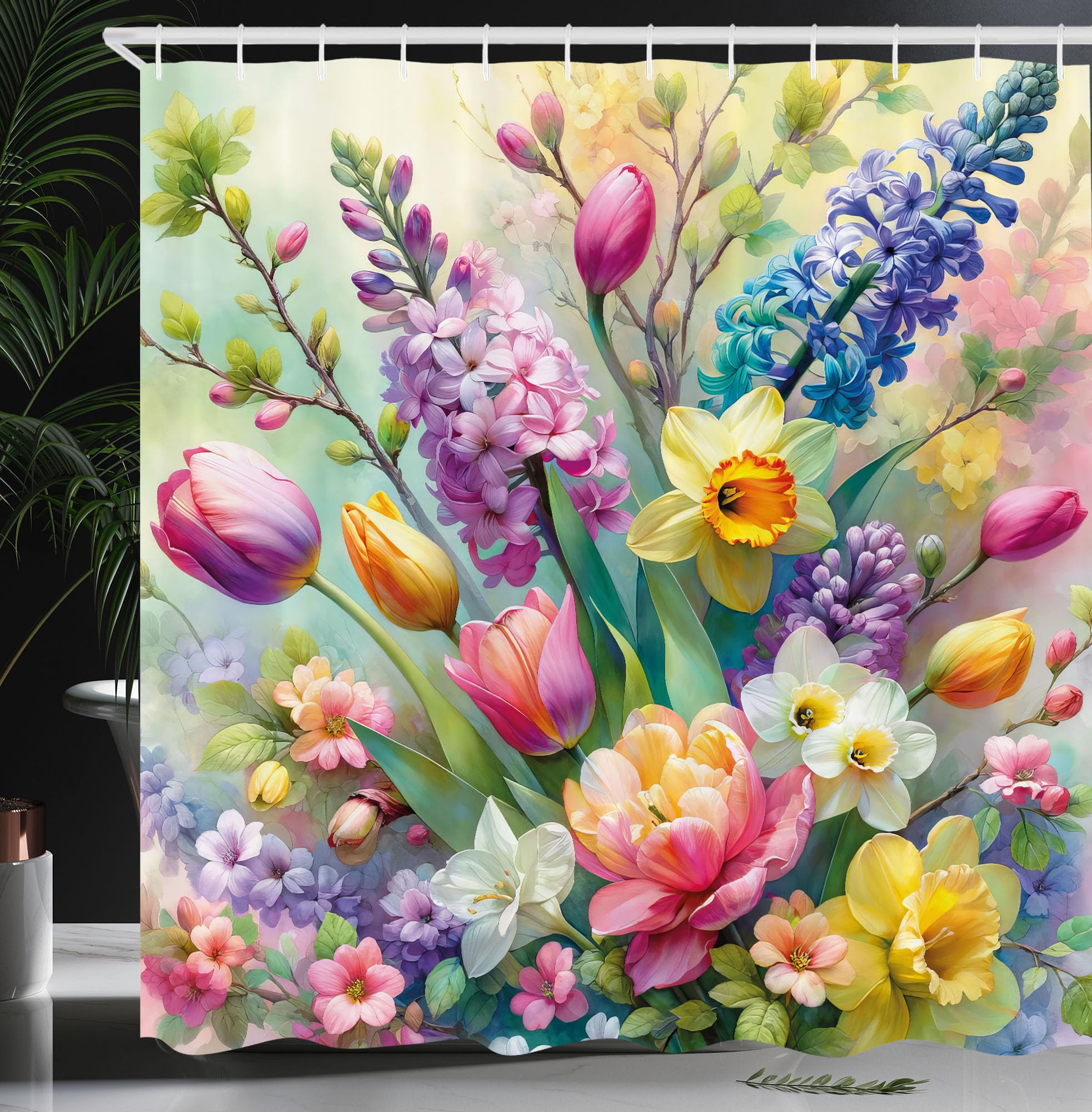 - Q: What are the dimensions of the Ambesonne Spring Shower Curtain? A: The Ambesonne Spring Shower Curtain measures 69 inches wide by 75 inches long.