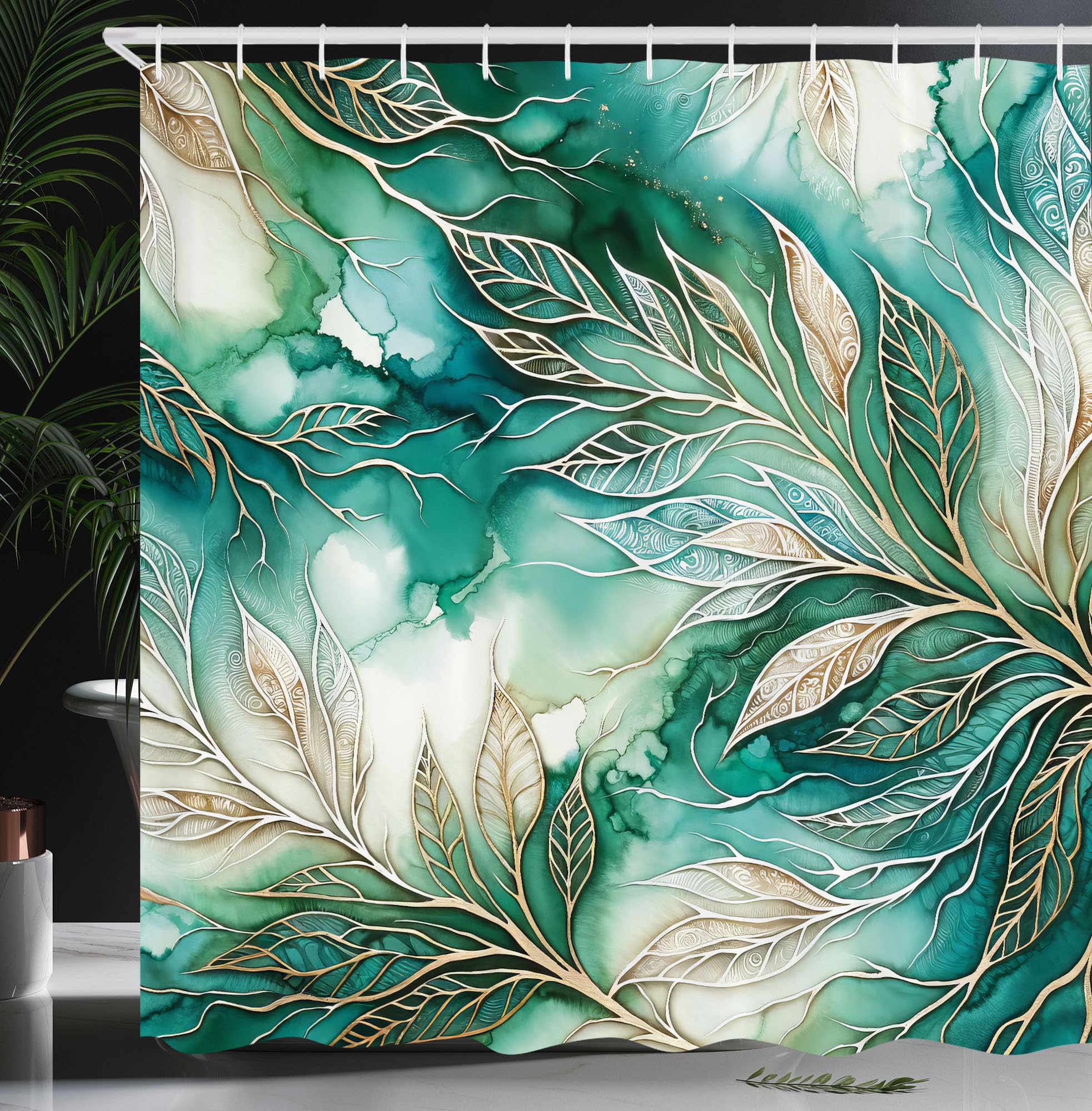 Ambesonne Teal Shower Curtain, Greenery Marble Print Look Atmosphere With Gold Yellow Tone Leafy Lines, Cloth Fabric Bathroom De