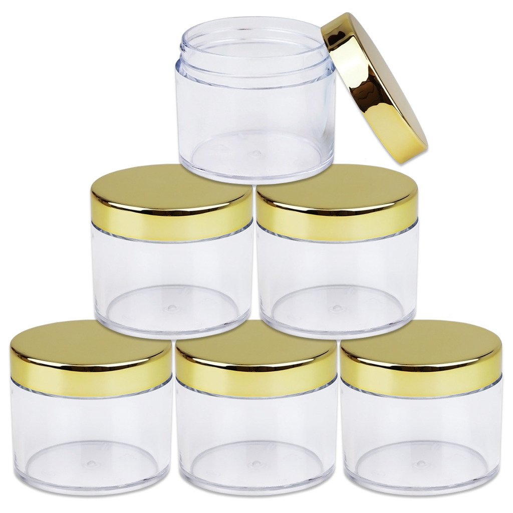 Beauticom 60 Grams/60 ML (2 Oz) Round Clear Leak Proof Plastic Container Jars with Gold Lids for Travel Storage Makeup Cosmetic Lotion Scrubs Creams Oils Salves Ointments (6 Jars)