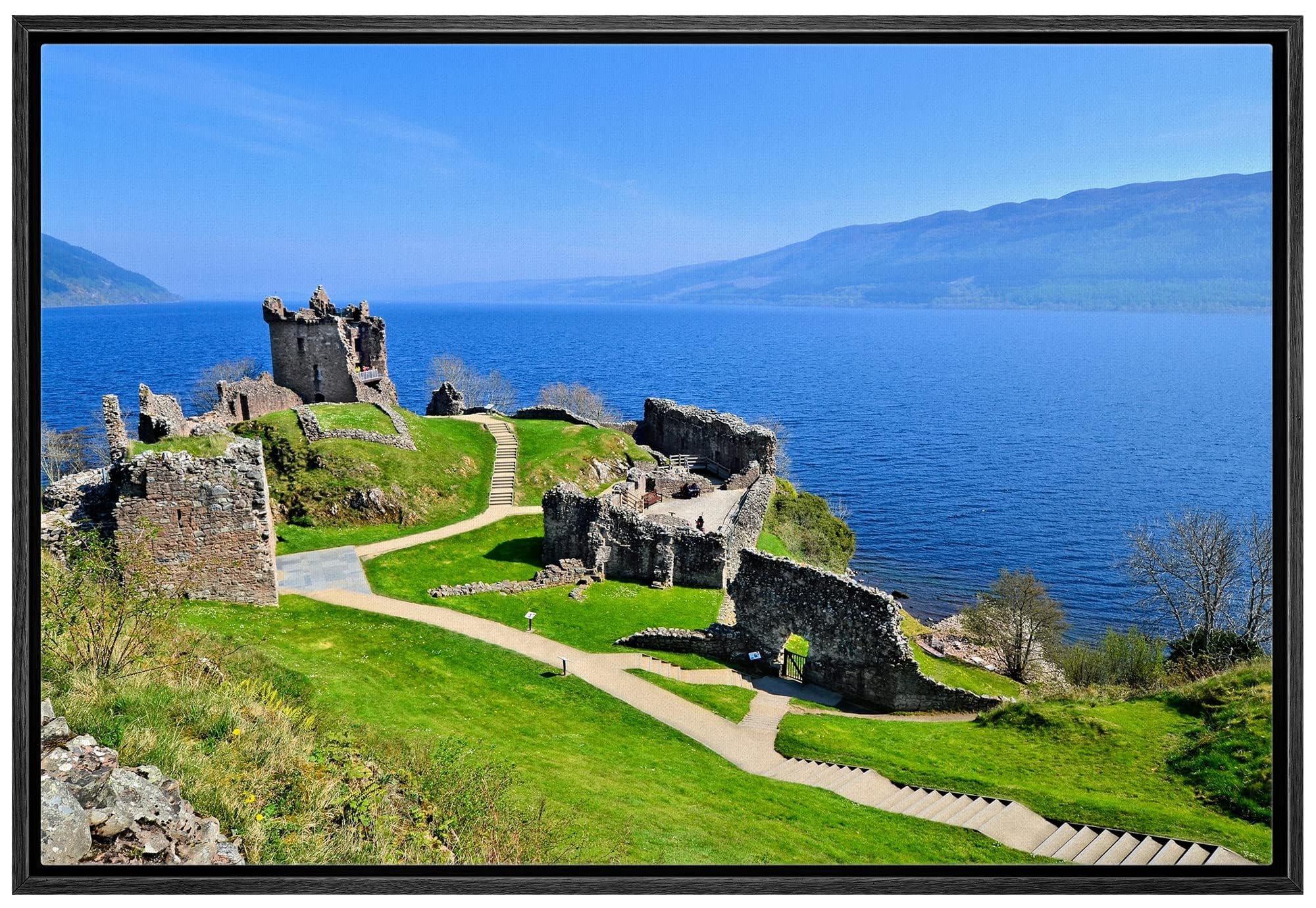 Beautiful Scenery Landscape Of Ruins Of Urquhart Castle Along Loch Ness Scotland - Framed Canvas Art Wall Art - 24''X36'' Black