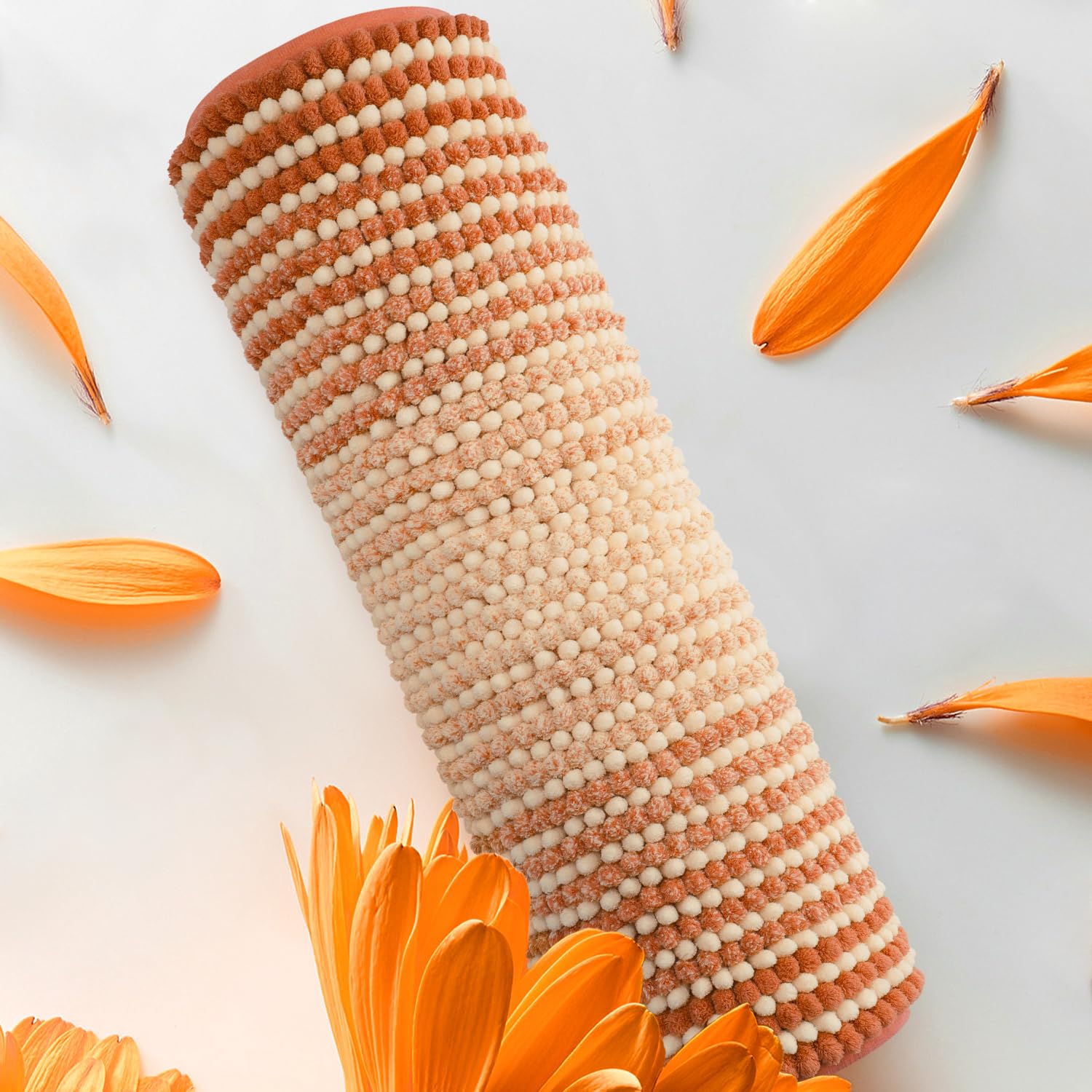 - Q: What colors are available for this bathroom rug? A: This rug features a unique dual-tone gradient design in pumpkin orange and cream colors, blending well with various bathroom decors.