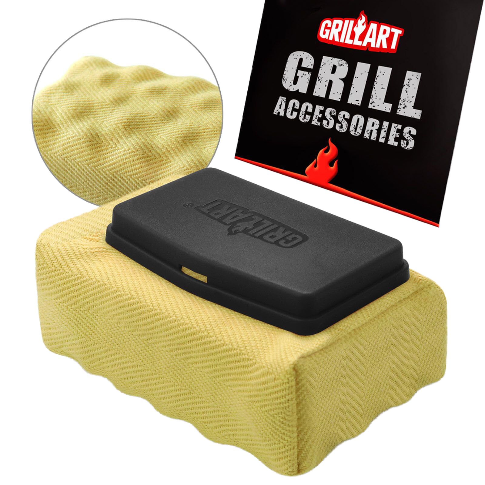 - Q: What is the GRILLART Grill Brush made of? A: The GRILLART Grill Brush features a cleaning head made of heat resistant foam wrapped in heat resistant cloth, ensuring safety and durability during use.
