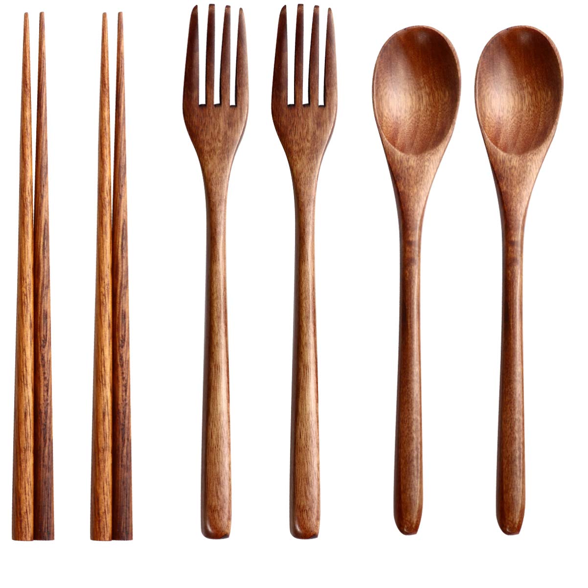 Hemoton 6 Pcs Wooden Flatware Tableware Cutlery Set Travel Utensils Wooden Fork Spoon Chopsticks Reusable Flatware Utensils For