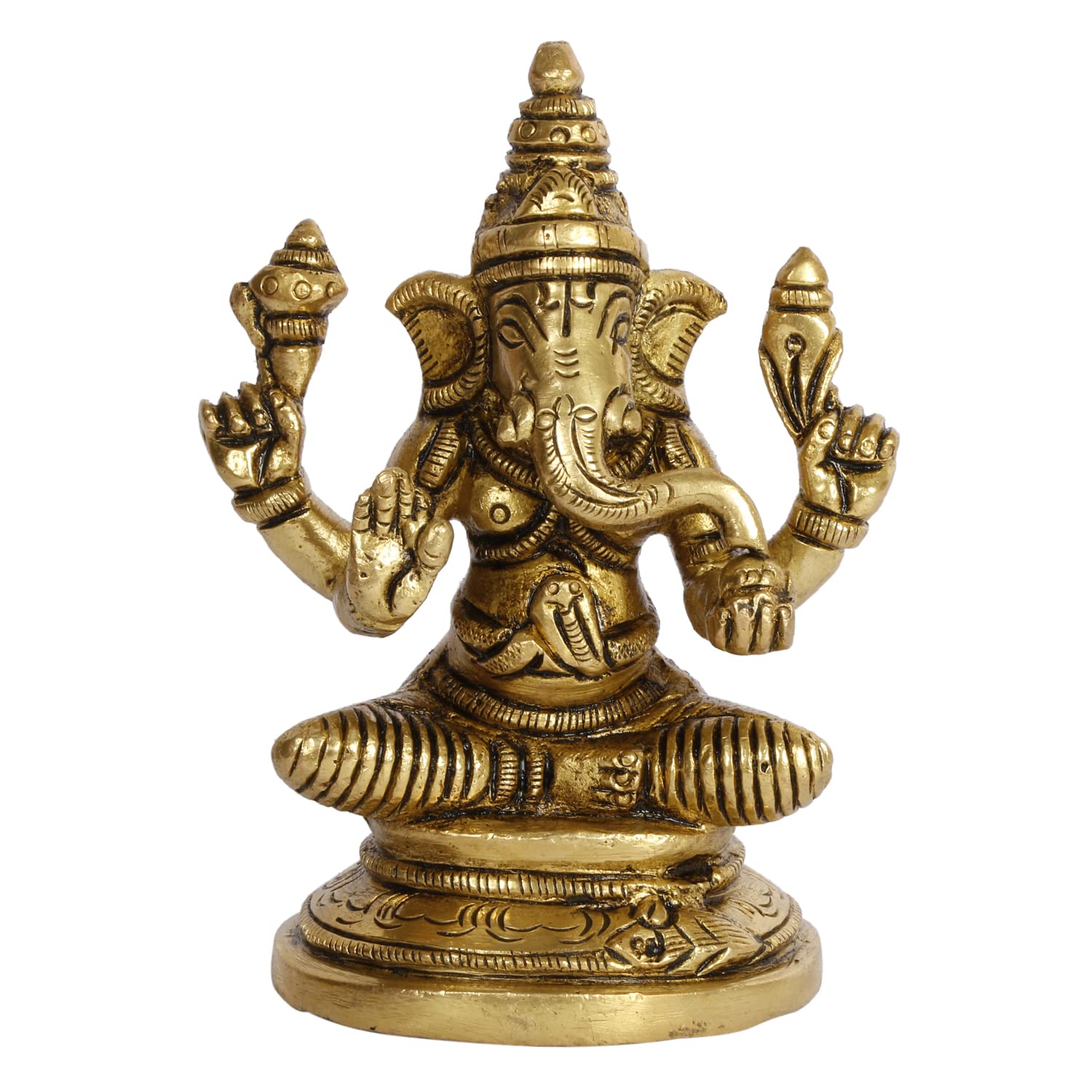 Kartique Brass Idol Ganesh Bhagwan Sitting In Blessing Posture Mangalkari Ganpati Bappa Murti Gold Color Height 3.5 Inch