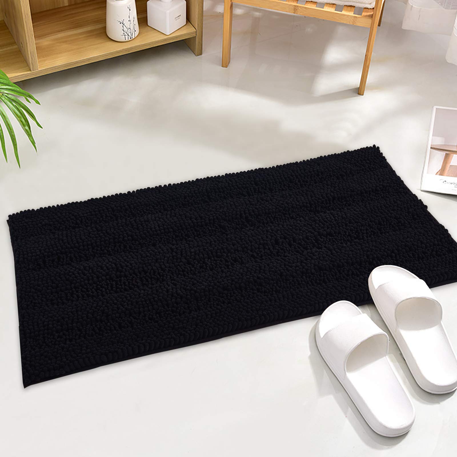 Kgorge Black Bath Mat - Quick Drying Bathroom Rugs Non-Slip Water Absorbent Thick Shaggy Chenile Shower Rug For Toilet Tub Kitch