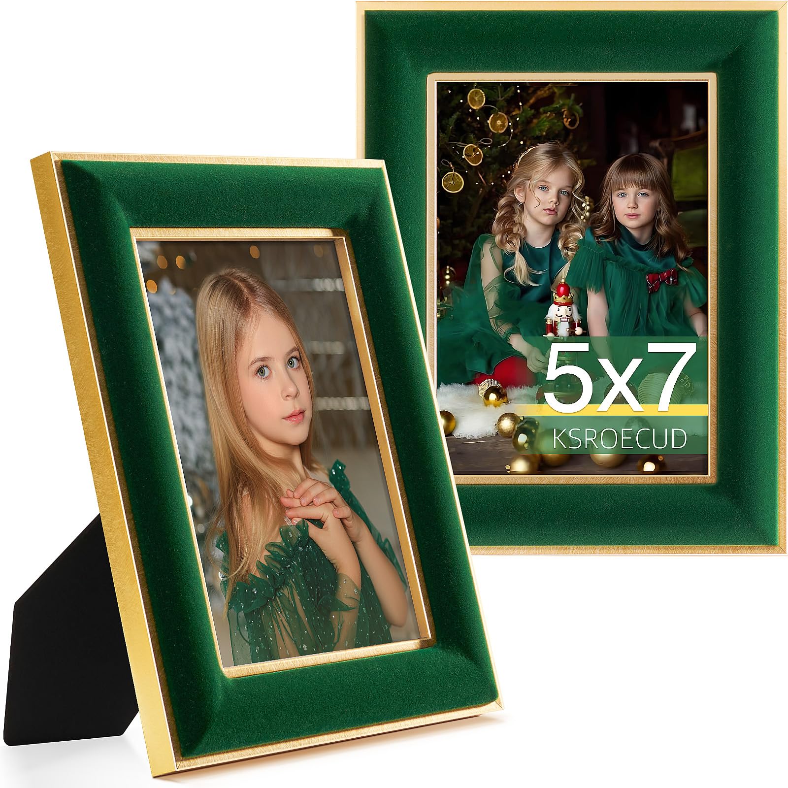 KSROECUD 5x7 Velvet Picture Frame, Green Photo Frames with Modern Simple Metallic Gold Border, HD Real Glass Horizontal & Vertic