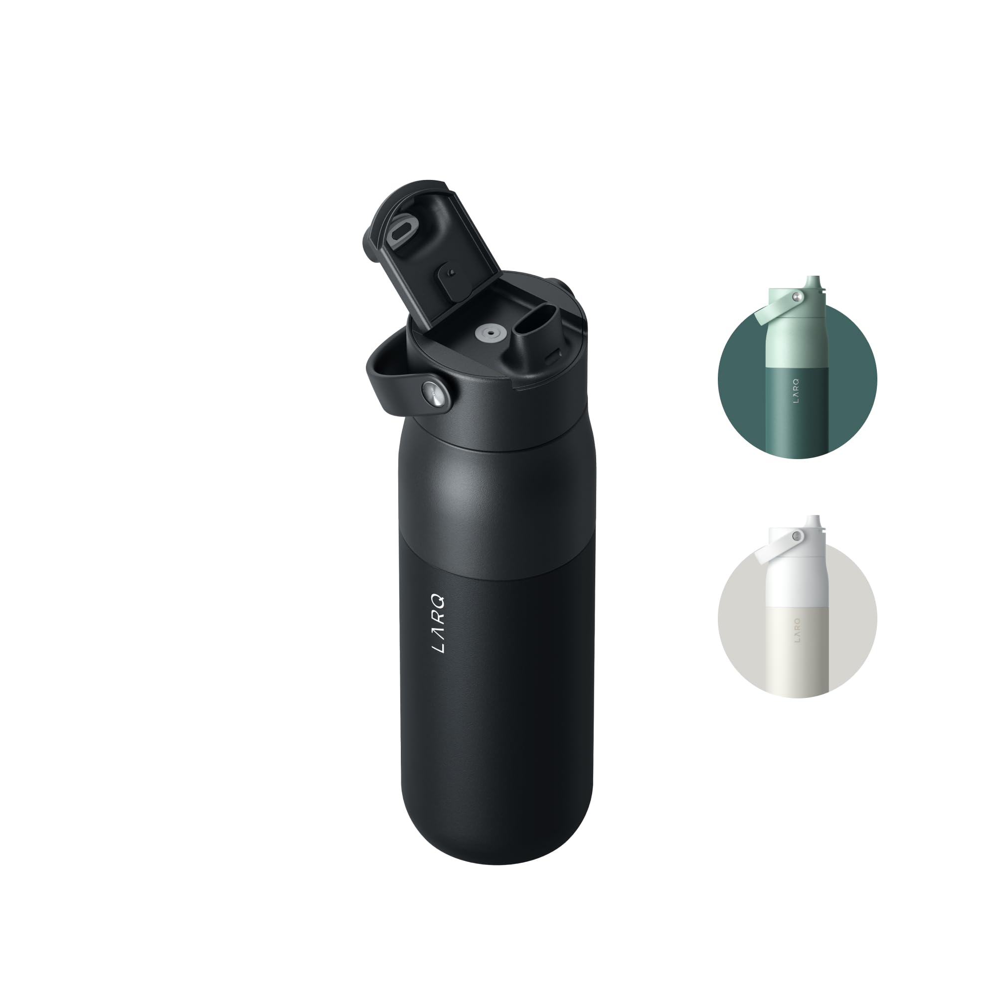• Q: What colors are available for the LARQ Bottle Swig Top? A: The bottle is available in three colorways: Obsidian Black, Eucalyptus Green, and Granite White.
