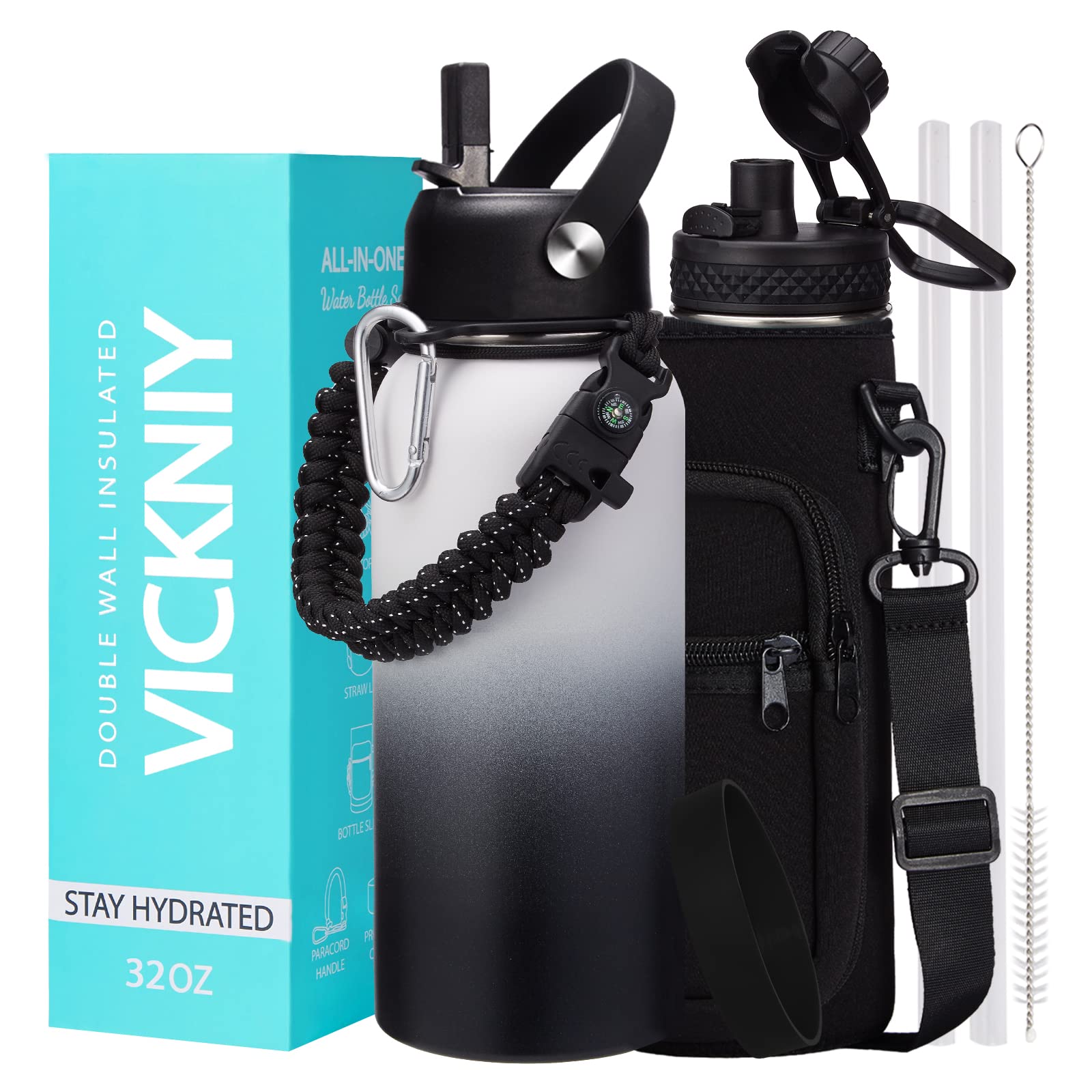 - Q: What accessories are included with the water bottle? A: The water bottle comes with 9 accessories: a straw lid, an auto chug lid, a paracord handle, two BPA-free straws, a carrier bag, a shoulder strap, a protective silicone boot, and a straw brush.