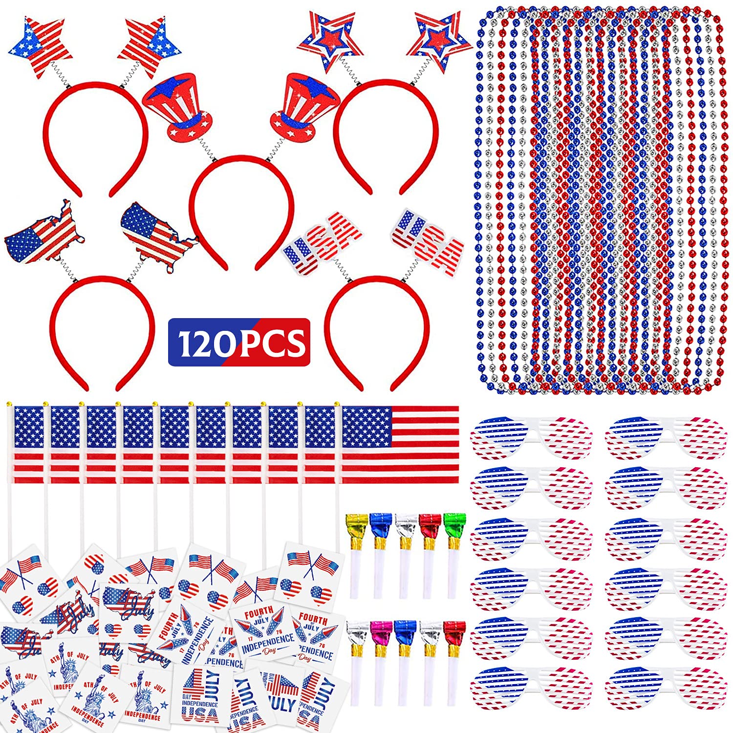 Movinpe 120 Pcs Patriotic Party Favors, 4Th Of July Accessories Headbands, Shutter Shades Glasses, Beaded Necklaces, Hand Held U