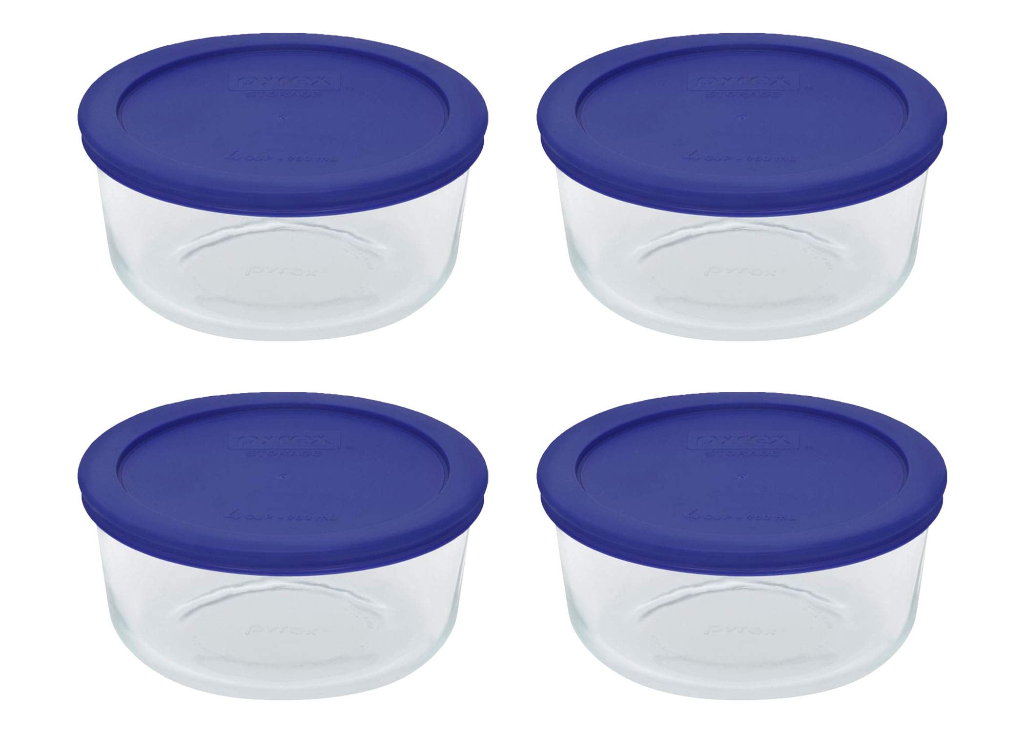 Pyrex Storage 4 Cup Round Dish, Clear With Blue Lid - Original Genuine Pyrex - Pack Of 4 Containers
