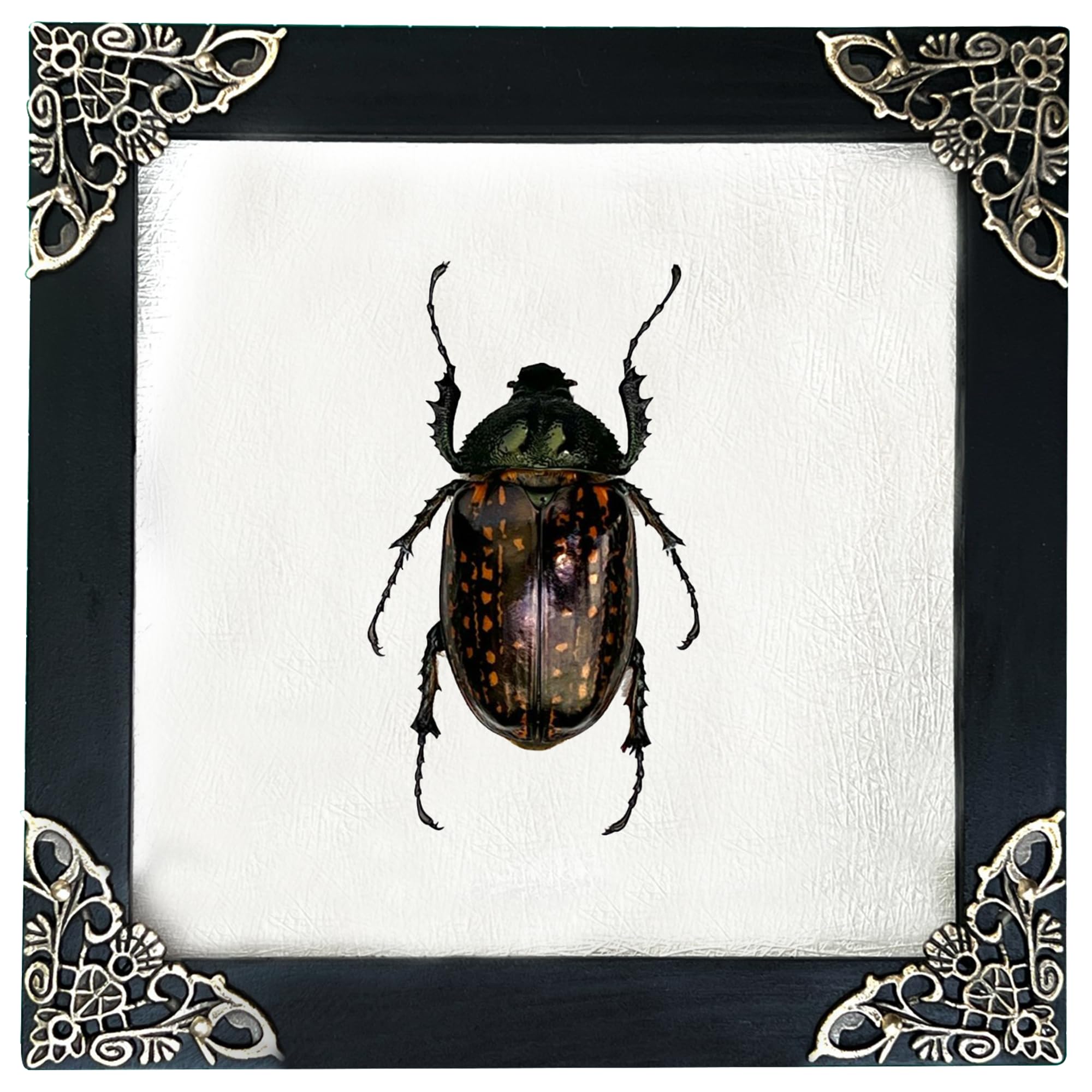 ?FRAMED ART: This listing is for 1 Real Framed Beetle Taxidermy from Vietnam. We make this handmade shadow box with a real dried dead butterfly and keep it well to retain its shape and color of it in its natural state. ?FRAME SIZE: 5.5 x 5.5 x 0.8 inch ( = 14 x 14 x 2 cm). The frame beetle was made of pine wood covered by 3 layers of paint coming with a special acrylic on the front to give a clear view, 4 brass baroque corner protectors in the corner, a hanger hook on the back & ready to hang. ?UNIQUE GIFT AND HOME DECOR: Our framed bugs and insects collection makes a gift for insect lovers of all ages. A wonderous curiosity ideal/ wall decor for any room you want to brighten up such as the living area, office, waiting area, the wall at home, tabletop, desk, or any horizontal surface, gallery d cor, reading room, home interior decoration, bedroom or kitchen, class, science, biology, gallery hotel, restaurant, coffee shop, perfect for schools, college or youth club projects. ?PRODUCT CHARACTERISTICS: Please keep in mind that the insect is natural products so they may have slight scratches or small quirks. The shape and color of the moth may vary from the pictures since its natural. In addition, not all specimens always look exactly the same; therefore, small deviations in the patterns and colors are possible. All insect is prepared by our own entomologists. ?SATISFACTION DELIVERY: Our priority is your happiness. Each of our products will be packed with the loving care of our staff, so it can be delivered in the same condition as you ordered. If you have any problems, please do not hesitate to contact us.