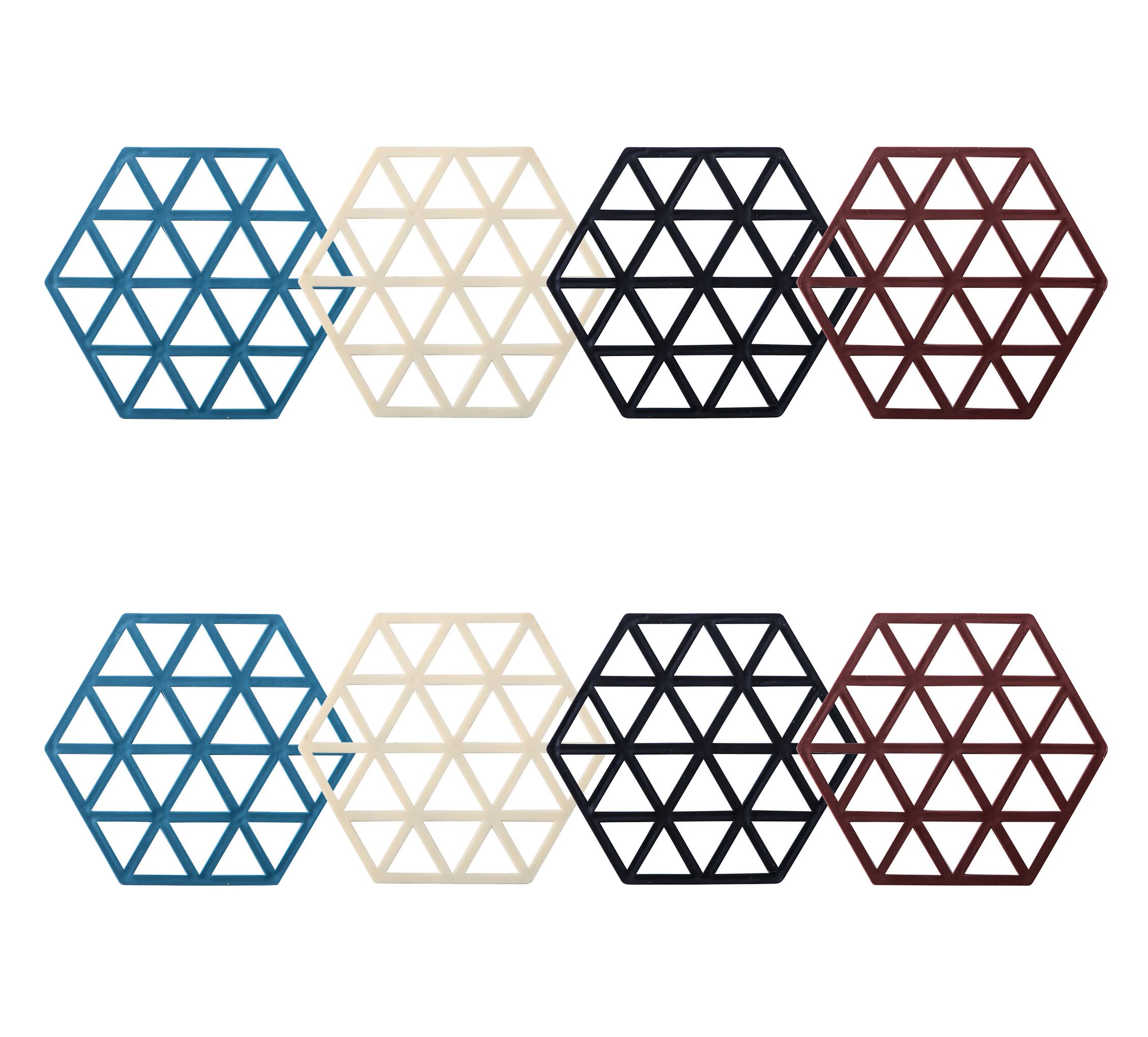 - Q: How many silicone trivet mats are included in the set? A: The set includes 8 pieces of silicone trivet mats, featuring 4 different colors with 2 mats of each color.