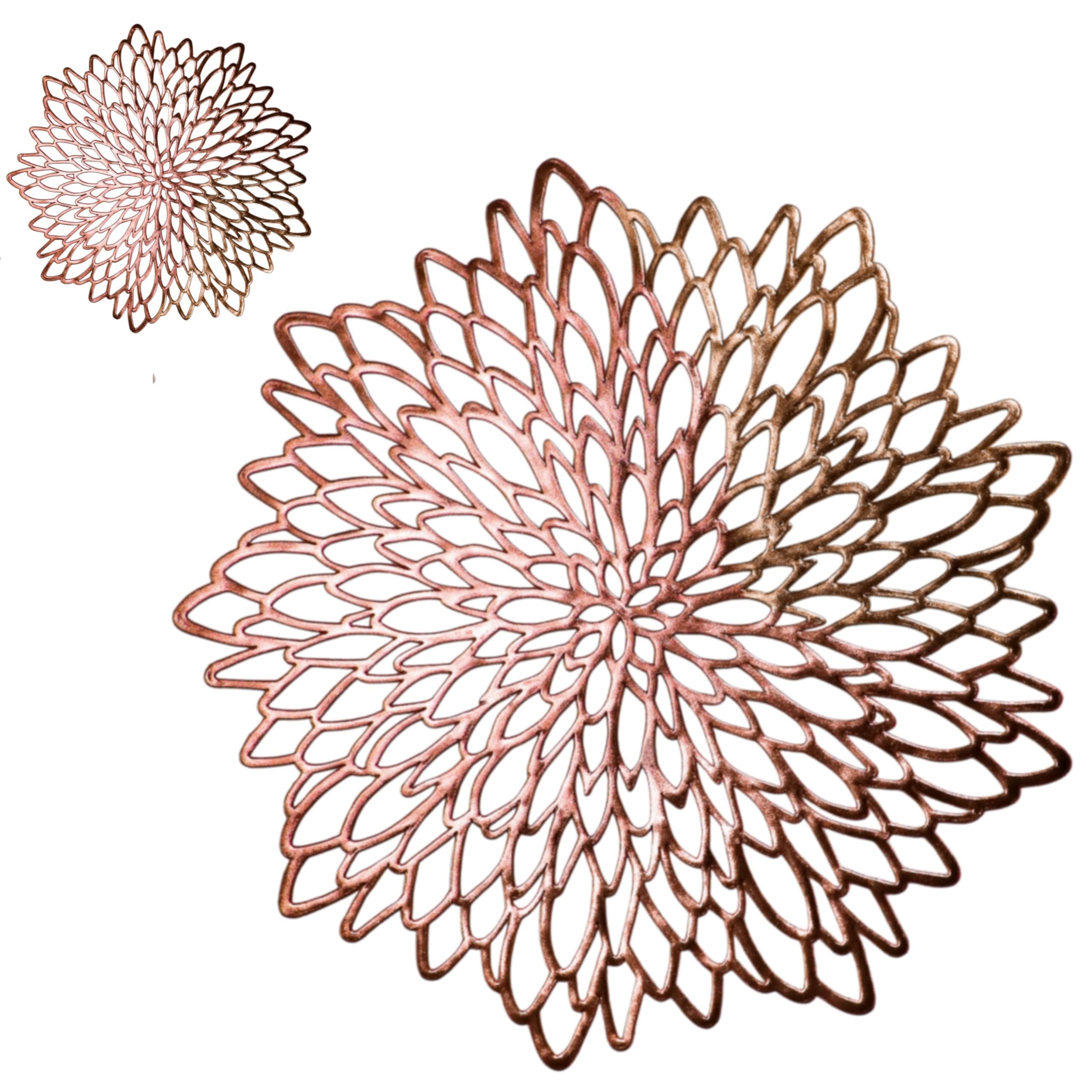 - Q: What are the dimensions of the Snowkingdom rose gold placemats? A: Each placemat has a diameter of 15 inches (38 cm), while the coasters measure 4 inches (10 cm) in diameter.
