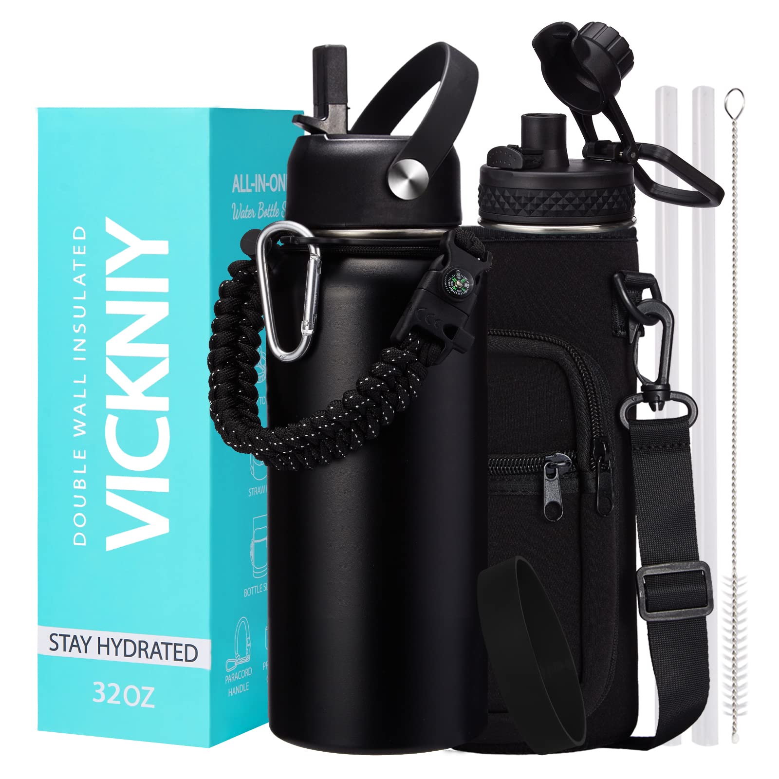 - Q: What are the key features of the VICKNIY 32oz Insulated Water Bottle? A: The VICKNIY 32oz Insulated Water Bottle features a vacuum insulated triple wall design, two leak-proof lids (auto spout lid and straw lid), a paracord handle with survival gear, and comes with nine accessories including a straw brush and carrier bag.
