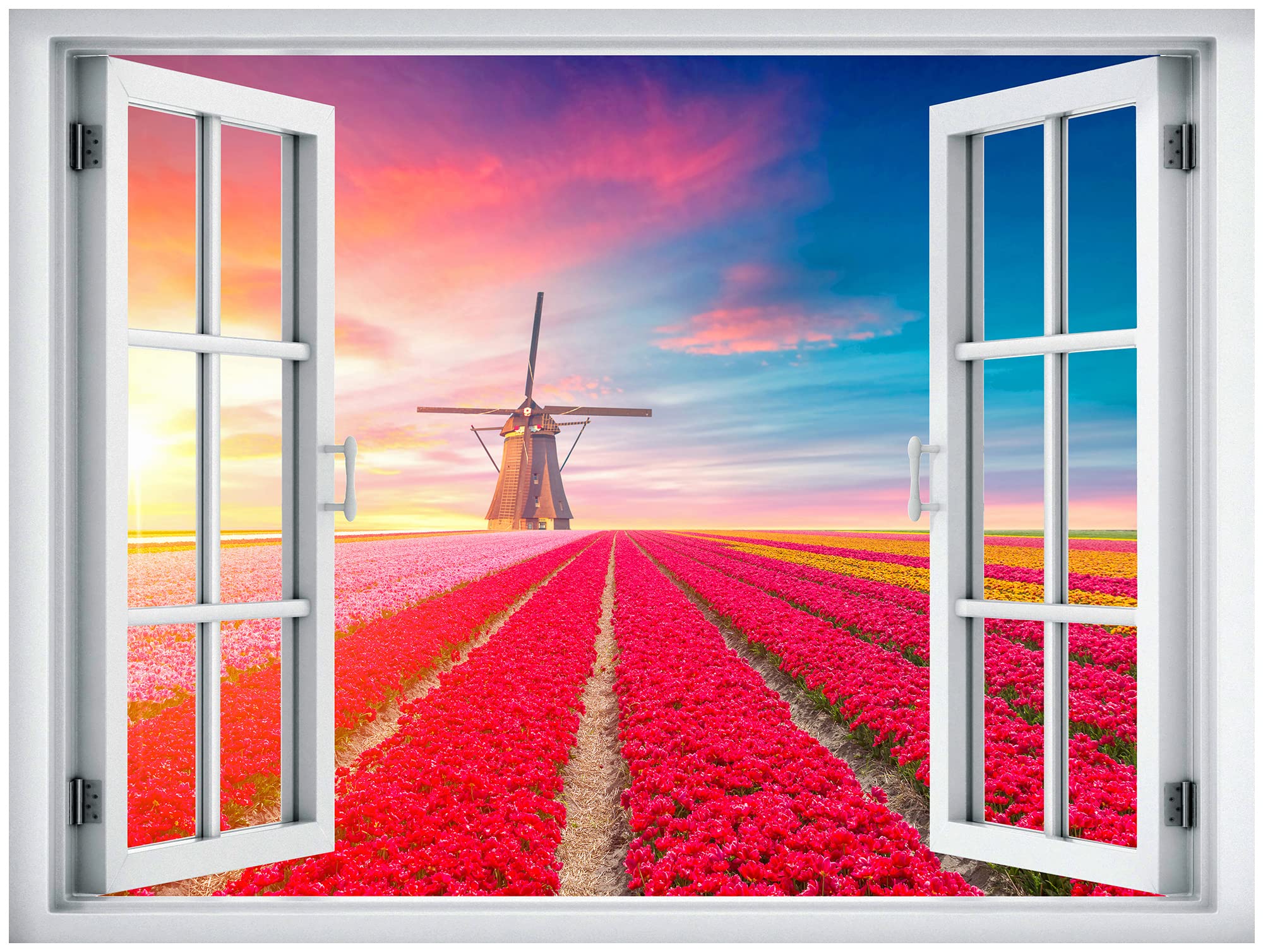wall26 Removable Wall Sticker/Wall Mural Window View Vibrant Sunset Dutch Windmill Flower Field Nature Wilderness Photography Realism Landscape Multicolor for Living Room Bedroom Office - 24''x32''
