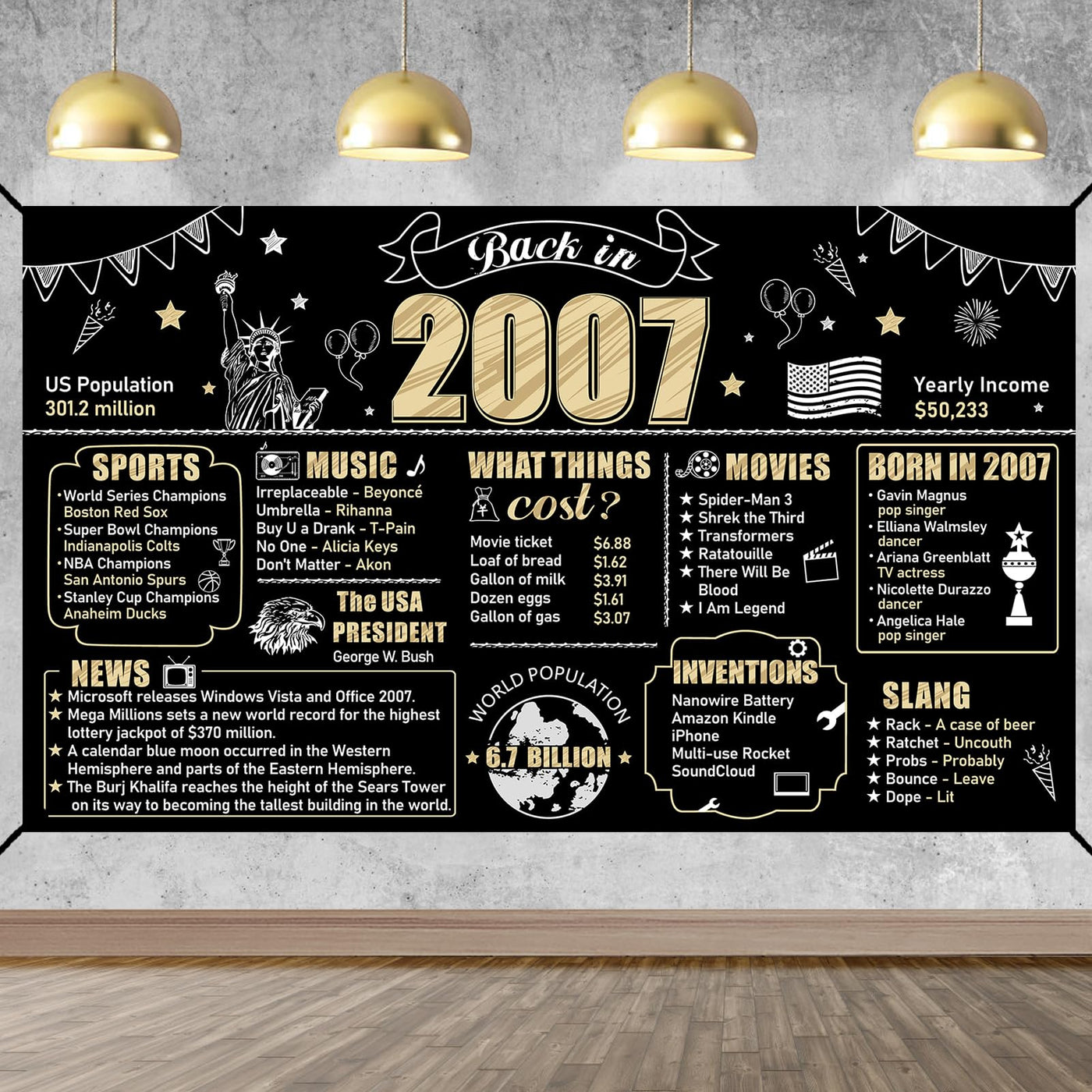 Large 18th Birthday Back in 2007 Banner Backdrop Decorations for Boys Girls, Black Gold 18 Birthday Poster Sign Party Supplies,
