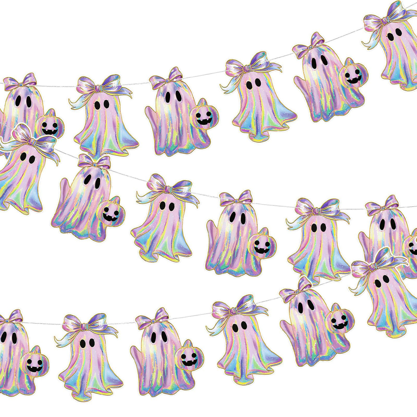 Oudain 2 Pack Halloween Ghost Garland 6.56 ft Iridescent Ghost Decor Laser Cute Boo Holographic Paper Bow Hanging Banner for Hal