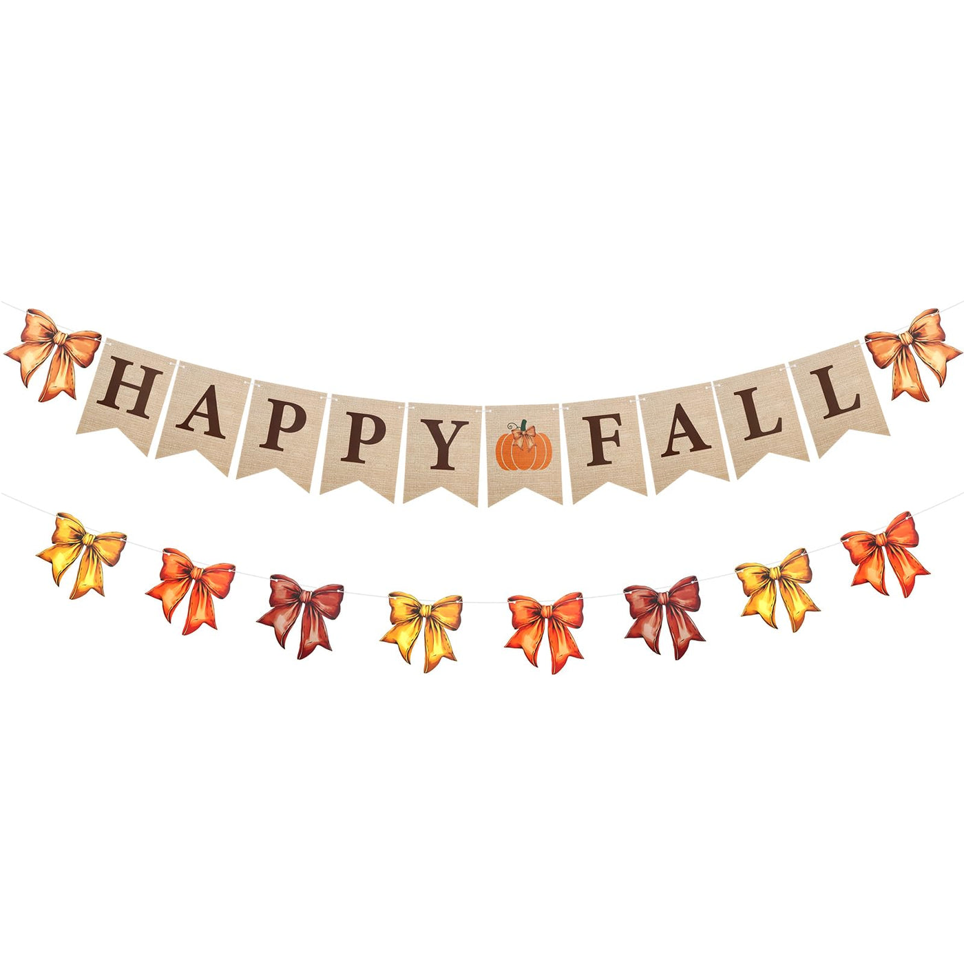 Oudain 2 Pack Happy Fall Burlap Banner with Bows Garland 6.56 ft Fall Banner Decor for Fireplace Autumn Bow Garland Paper Hangin