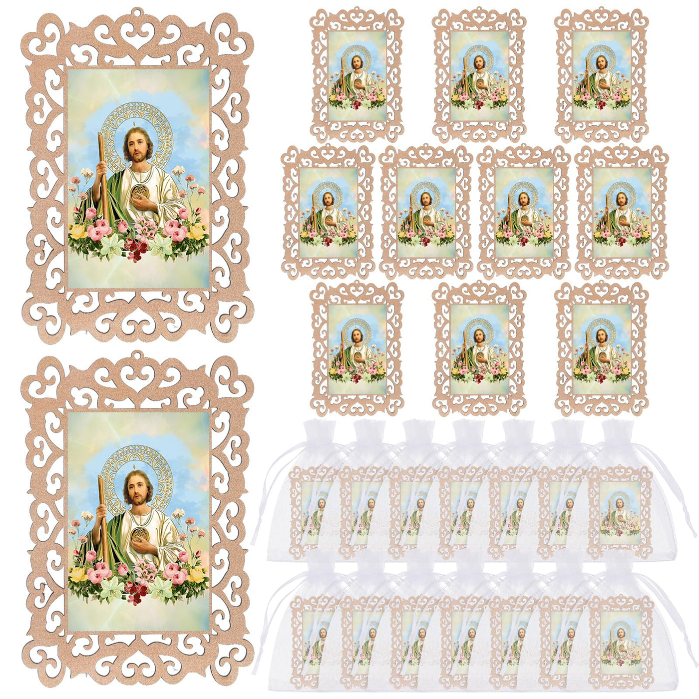 Quelay 24 Pcs Catholic Saint Jude Wooden Picture Frames with Organza Gift Bags Baptism Favors for Guests First Communion Christe